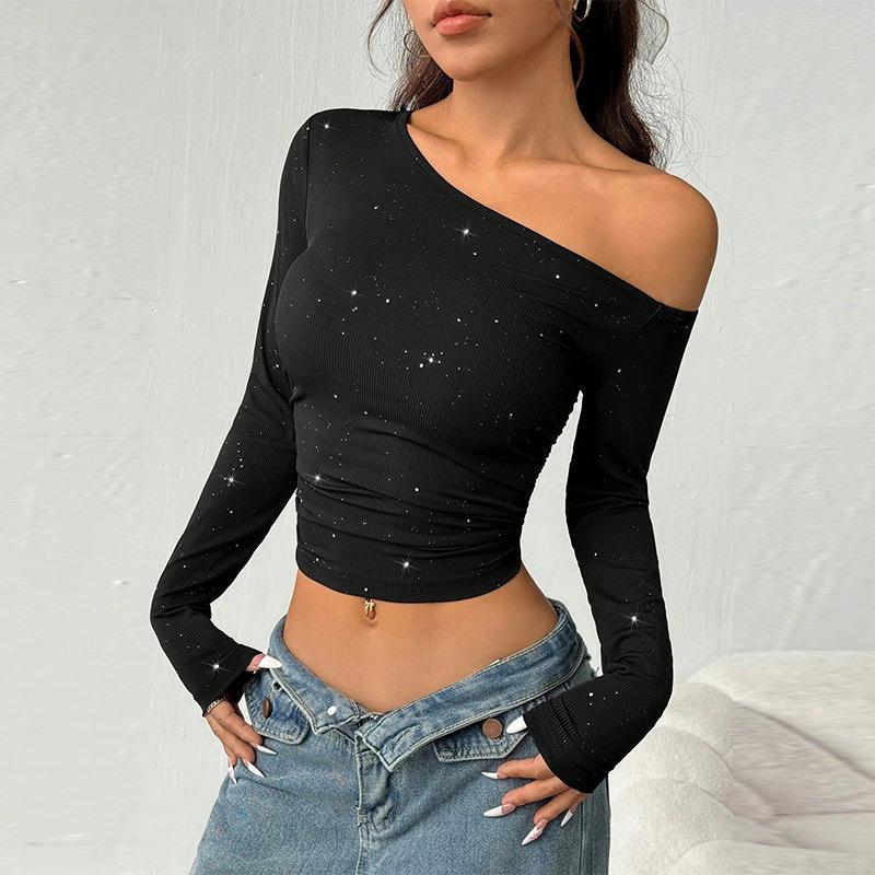 Европейско-американская футболка с горячими бриллиантами на косом плече с длинным рукавом для женщин Весенний облегающий вязаный топ-основа — купить товар онлайн с бесплатной доставкой по всему миру!