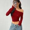 Европейско-американская футболка с горячими бриллиантами на косом плече с длинным рукавом для женщин Весенний облегающий вязаный топ-основа