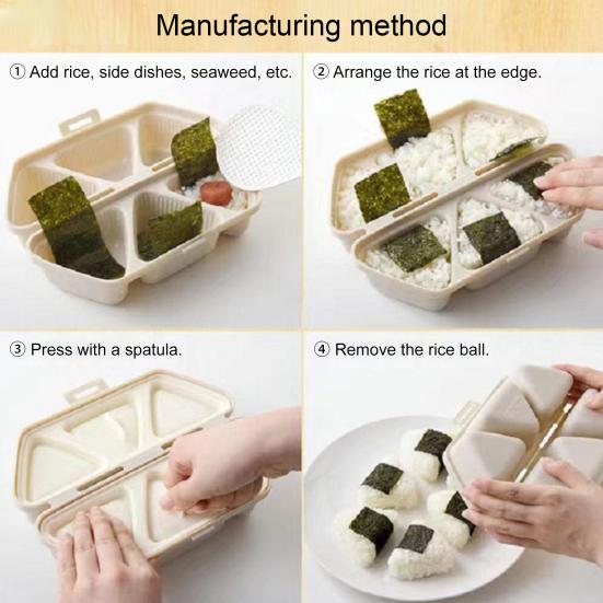 Эффективная функциональность формы для рисовых шариков: Изготовленная из прочного пищевого полипропилена, форма 6-в-1 включает шесть треугольных ячеек с антипригарной поверхностью для легкого извлечения рисовых шариков.. Эта функция позволяет пользователям готовить несколько рисовых шариков одновременно, оптимизируя приготовление пищи для суши, закусок или блюд из плантанов..