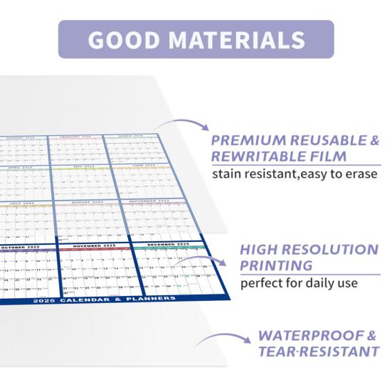 Благодаря прочным ручкам с функцией влажного стирания, которые не выцветают и не оставляют разводов, вы можете писать уверенно, не беспокоясь о случайных стираниях из-за трения.. Оставайтесь организованными и эффективными с нашим надежным настенным календарем на 2025 год.