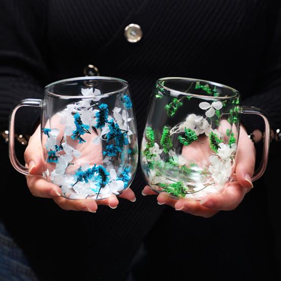 Каждая кружка украшена собранными вручную цветами, сохраненными в стекле, что делает ее уникальным подарком для любителей кофе.. Благодаря емкости 250 мл и ручке с защитой от ожогов наслаждайтесь любимыми напитками с комфортом.. Конструкция с двойными стенками создает иллюзию подвешенного напитка, усиливая вкус и продлевая удовольствие от питья.