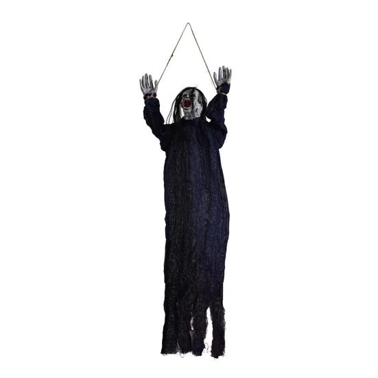 Жуткий Шарм: Декоративное подвесное привидение на Хэллоуин может похвастаться угрожающим лицом-черепом, свирепым выражением лица, облачением в мантию и поднятыми руками, что создает по-настоящему пугающую атмосферу, которая завораживает зрителей.