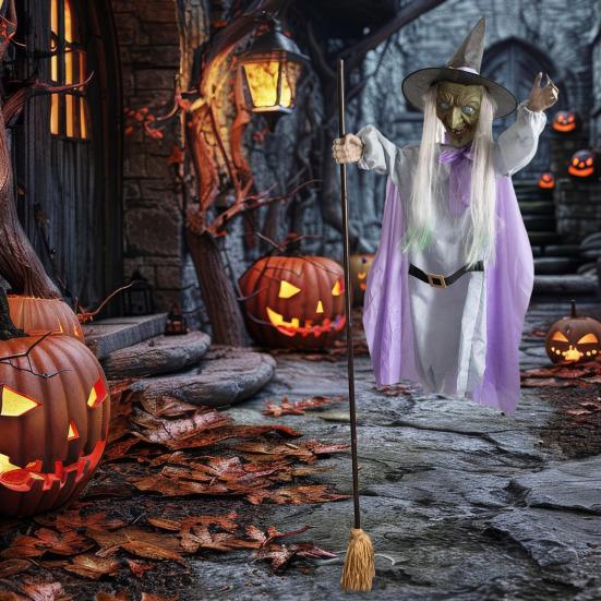 Интерактивное движение: Датчики звука и движения активируют движения челюстей, подсвечивание глаз и жуткие звуковые эффекты, усиливая ощущение присутствия ведьмы и добавляя интерактивный элемент в ваш уличный декор.