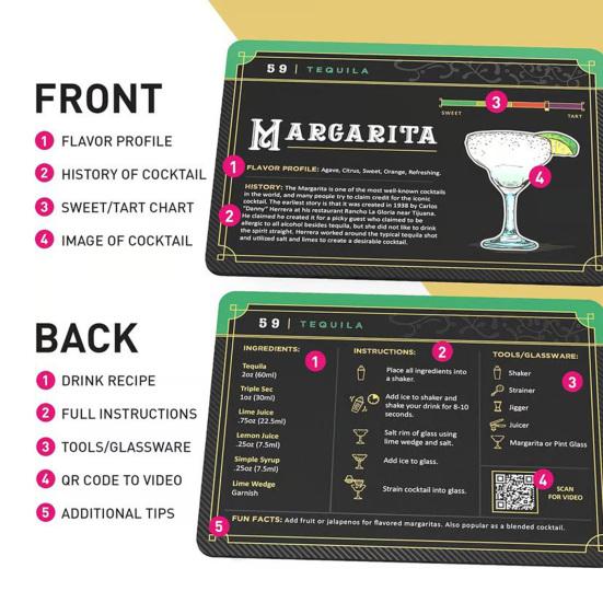 Совершенствуйте свои навыки бармена с помощью набора карточек с рецептами коктейлей! Погрузитесь в увлекательную историю коктейлей, каждый напиток которой повествует уникальную историю из прошлого.. Раскройте происхождение и значение классических коктейлей, изучив более 100 рецептов, включенных в этот набор.. Эти коктейльные открытки изготовлены на прочной высококачественной бумаге с яркими цветами, которые не выцветают, и рассчитаны на долгий срок службы..