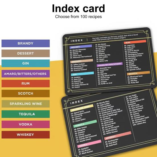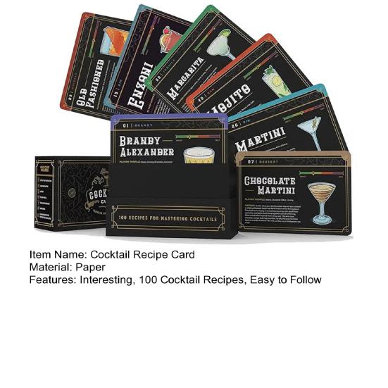 Подарите бесконечные возможности приготовления коктейлей с нашим набором карточек с рецептами коктейлей. Эти открытки станут продуманным и практичным подарком, который подарит вам часы увлекательных экспериментов и вкусных открытий как для начинающих барменов, так и для опытных любителей коктейлей.