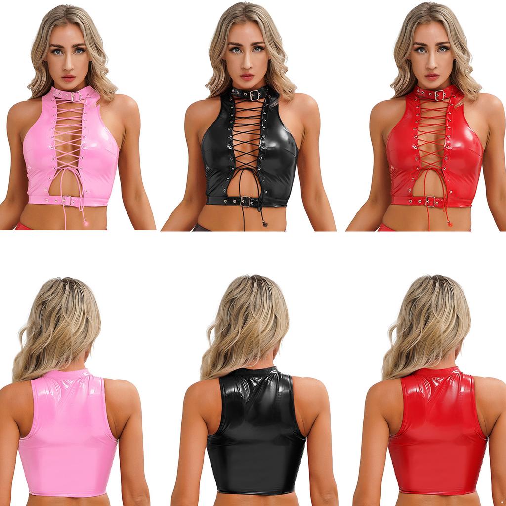 Женский готический стиль мокрый вид кроп-топ люверсы шнуровка деталь лакированная кожа без рукавов клубная вечеринка жилет