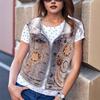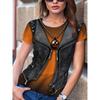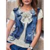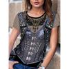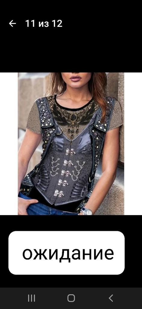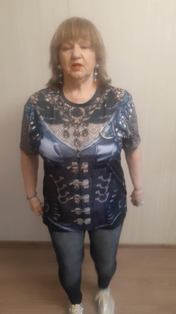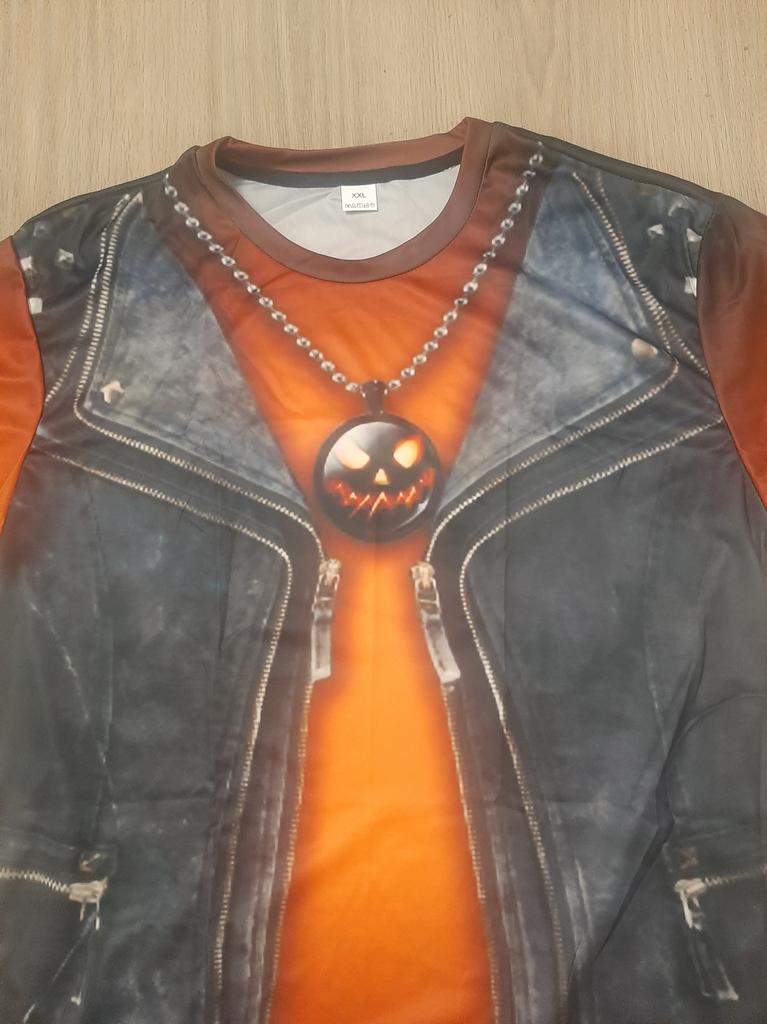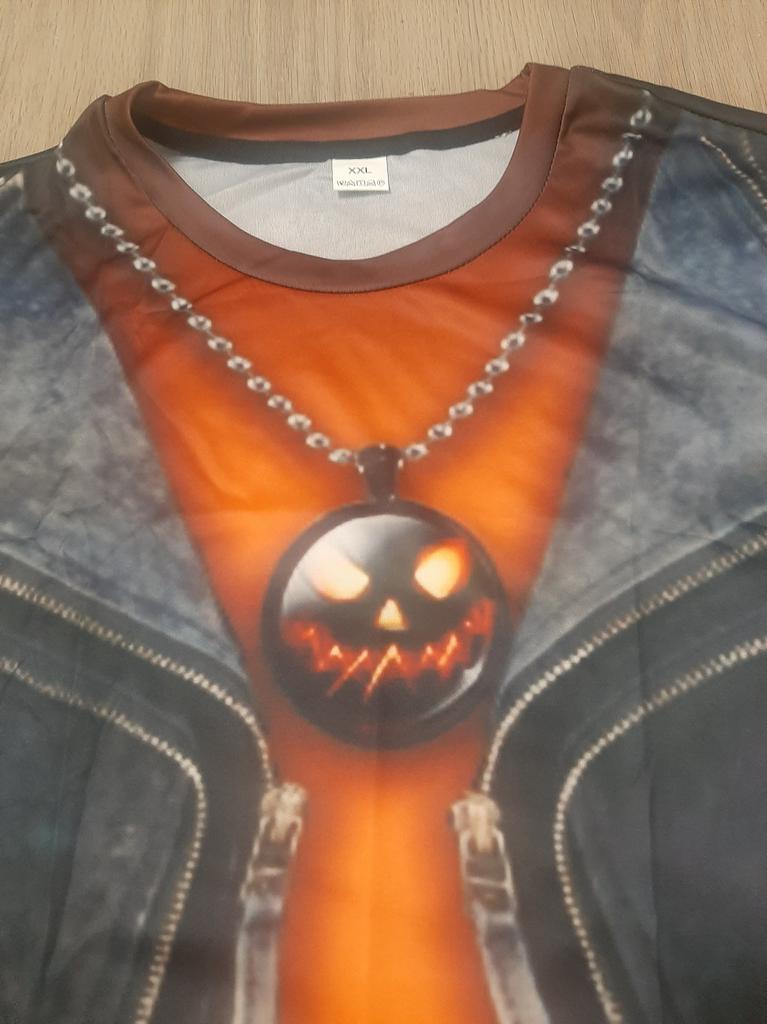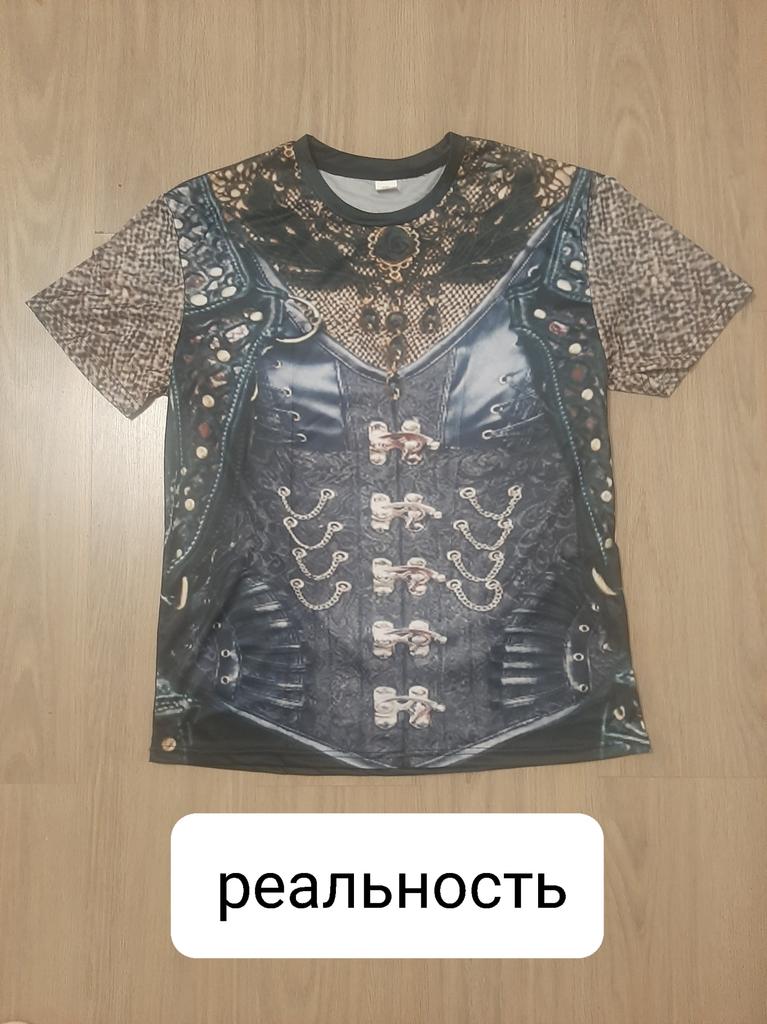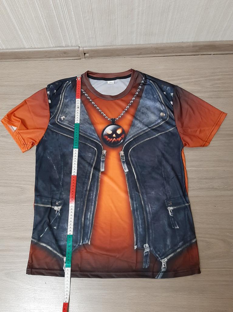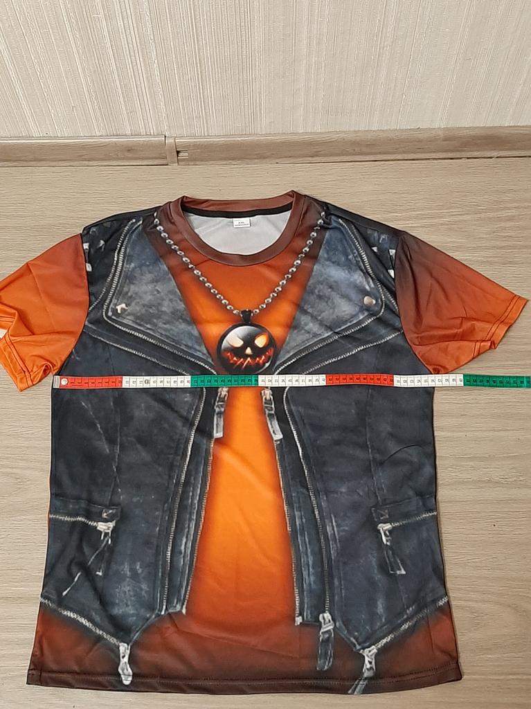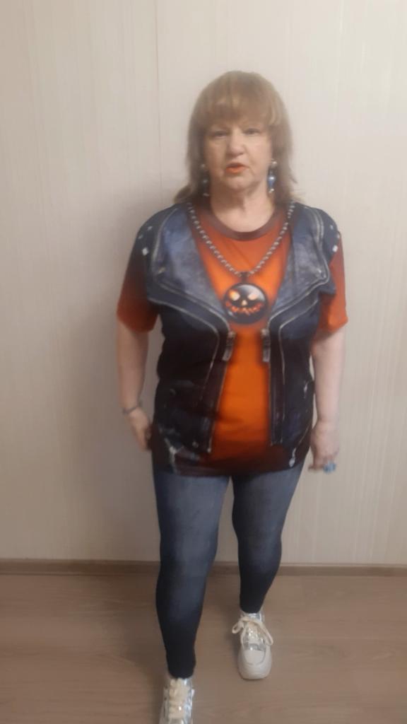 Футболка с рисунком 3д, имитация джинсовой жилетки. Всё хорошо, всё устраивает. Но плохо, что имитация кулона у них, чем больше размер футболки, тем крупнее кулон. Зачем? Ну и рисунок кулона тыква для хеллуина мне не подходит. Буду закрывать его какой-то плоской крупной брошкой. Мои параметры квадрат 110-100-110, рост 159 см. Размер взяла 2XL.