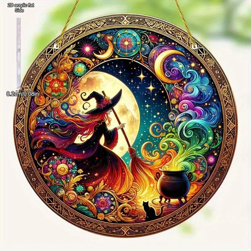 1pc Halloween Witch Stain Art Window Hanging Suncatcher Plaque Acrylic Round Wreath Decoration Indoor Outdoor Window Decora