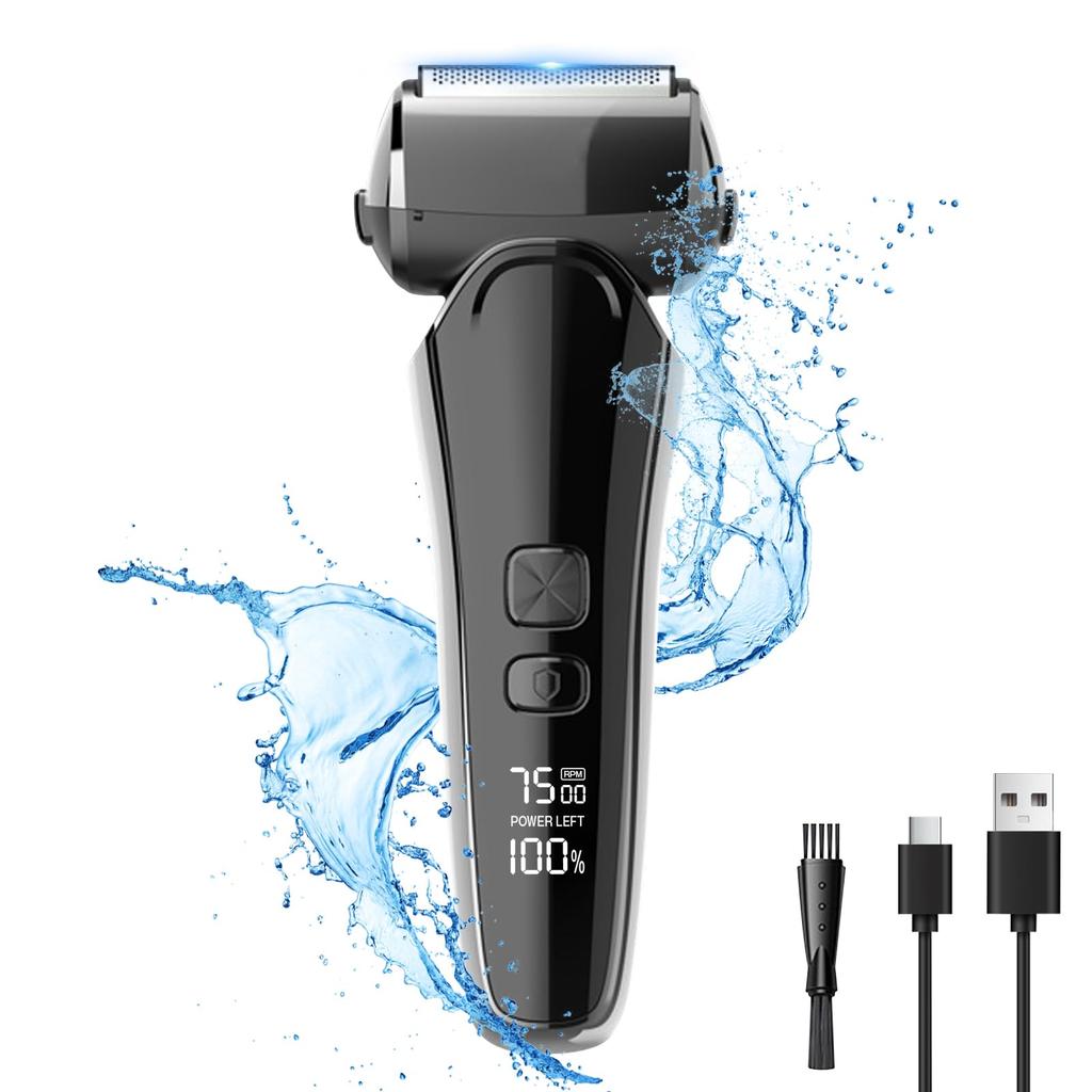 Triple-Blade Electric Shaver with 120-Minute Continuous Use, Reciprocating Type-C Rechargeable, IPX7 Waterproof, Large LED Screen, and Wet/Dry Use
