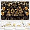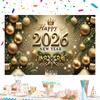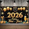 Shiny 2026 New Year Backdrop Banner Colorful Balloon Black Gold Photography Background Letter Champagne Celebration Banner Event