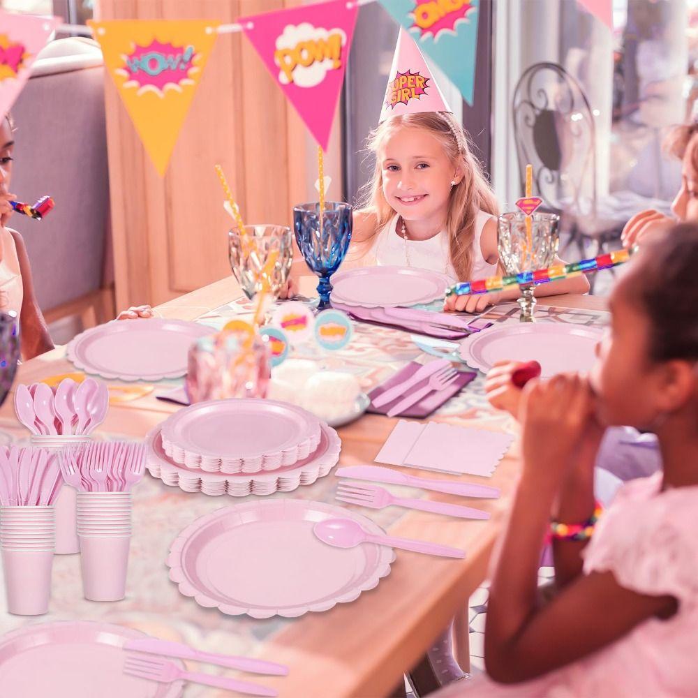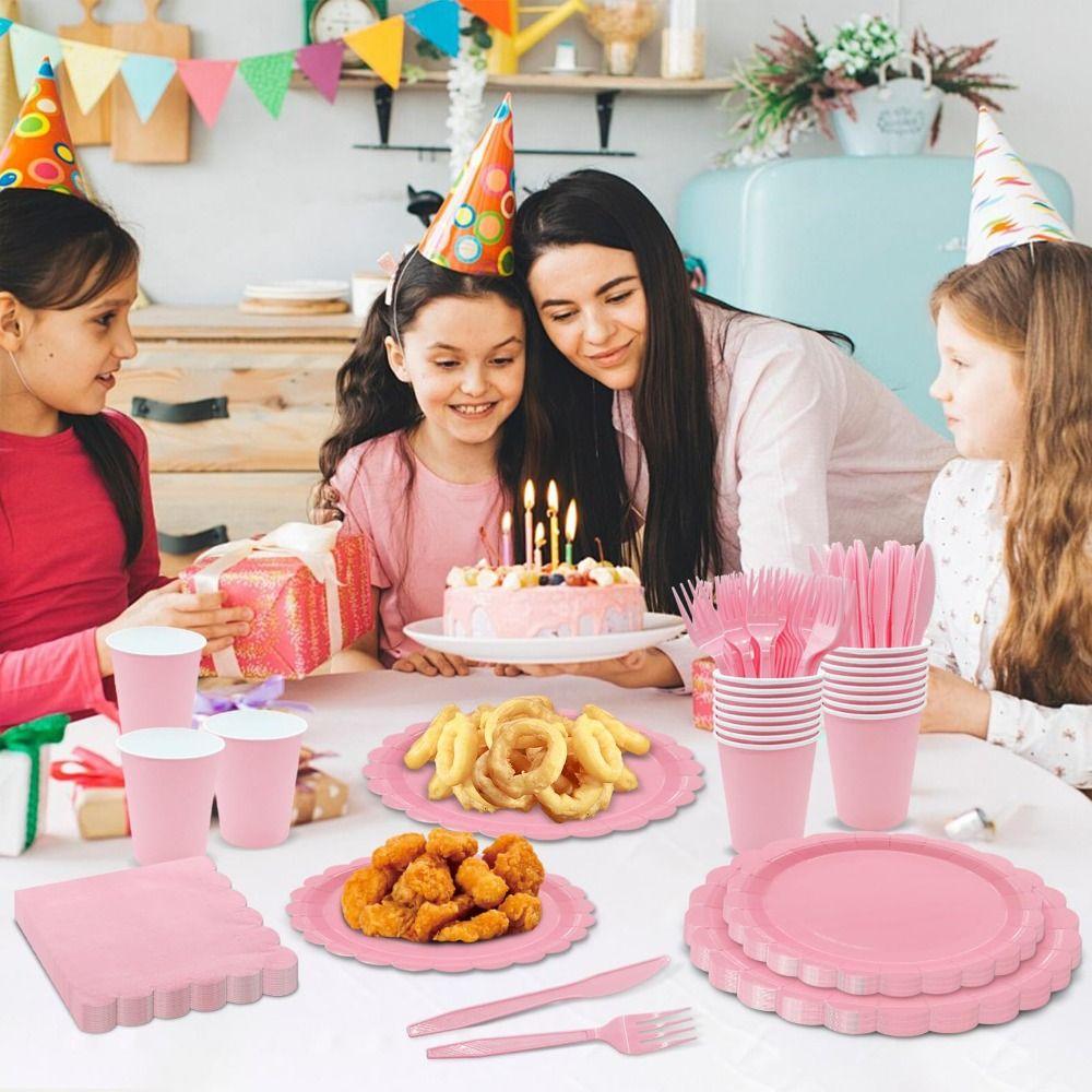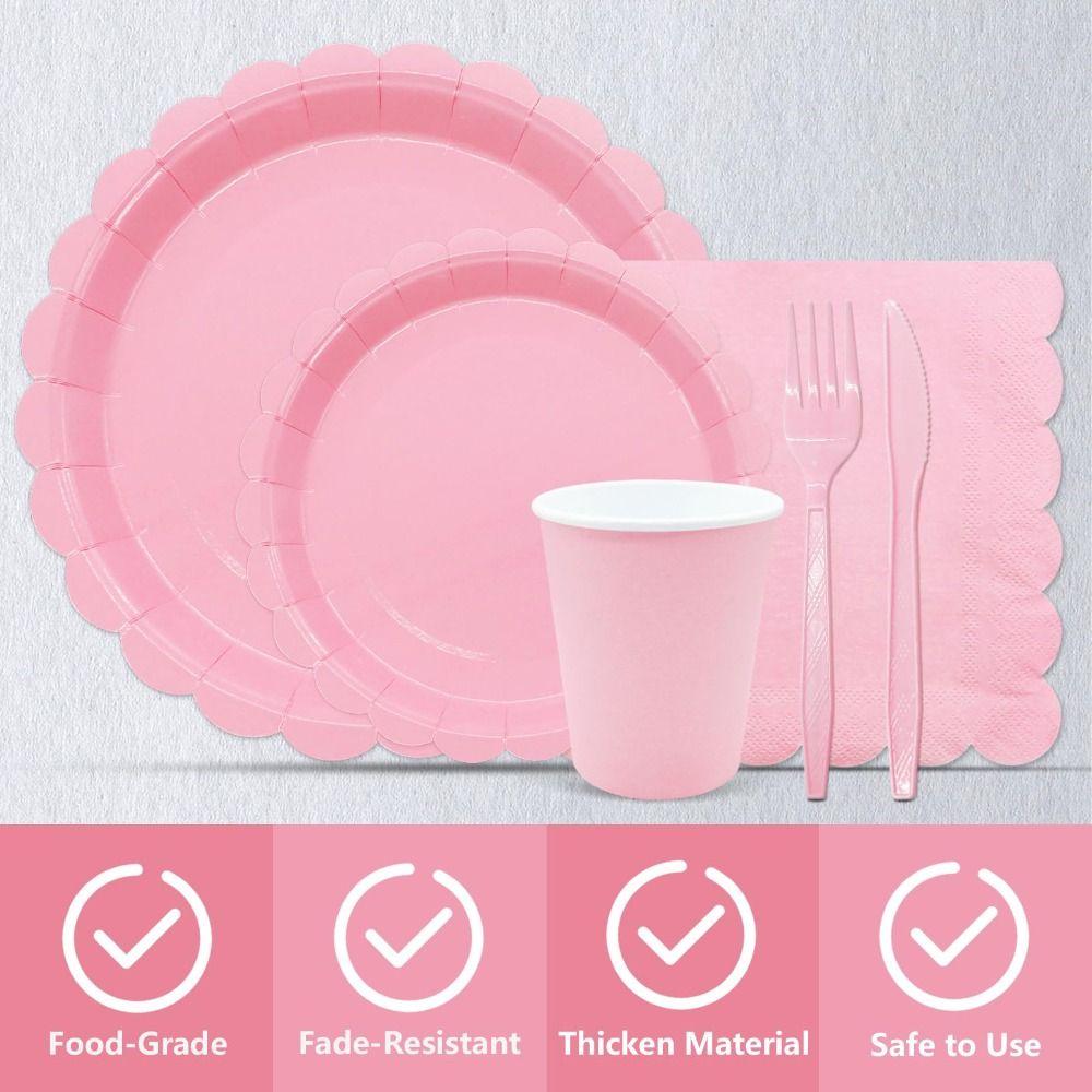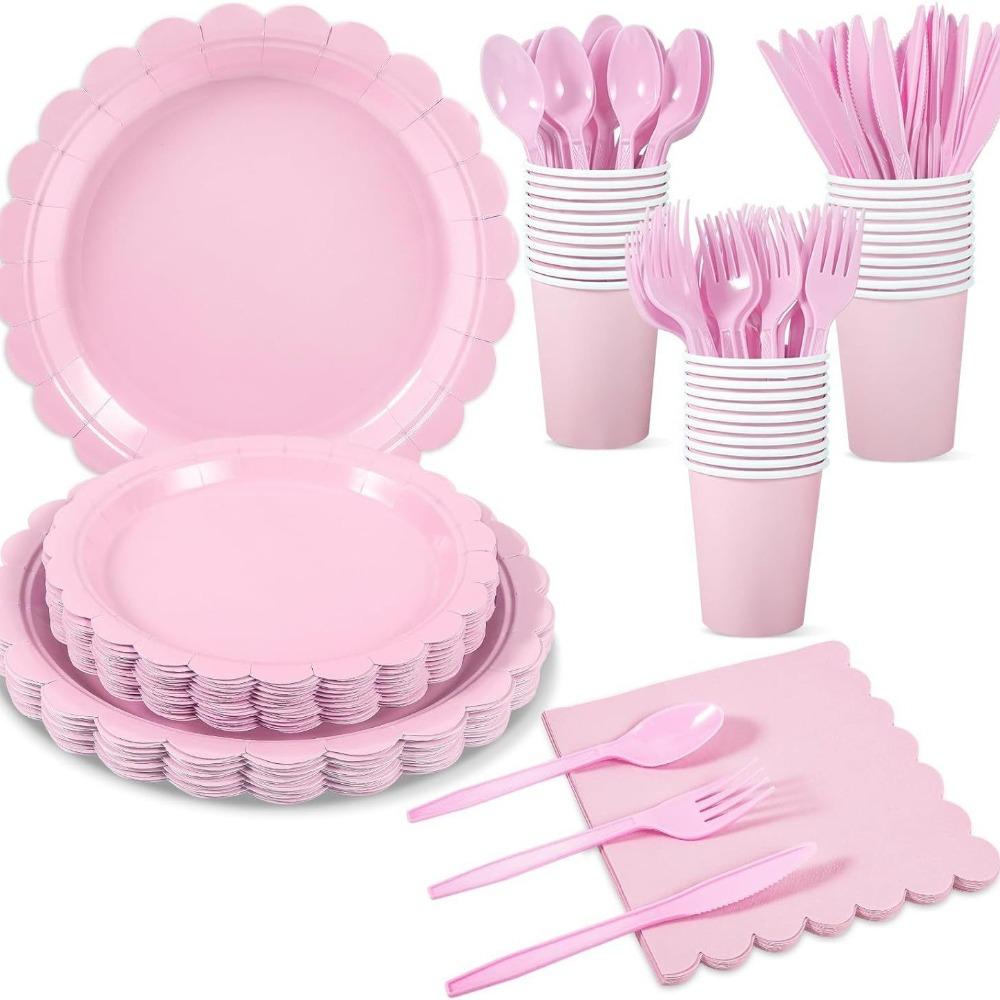 1. Набор принадлежностей для вечеринок: Включает 24 одноразовые розовые бумажные тарелки 9 дюймов, 24 одноразовые розовые десертные тарелки 7 дюймов, 24 бумажных стакана 9 унций, 24 синие бумажные салфетки 6,5 дюймов, 24 пластиковые вилки, 24 ножа