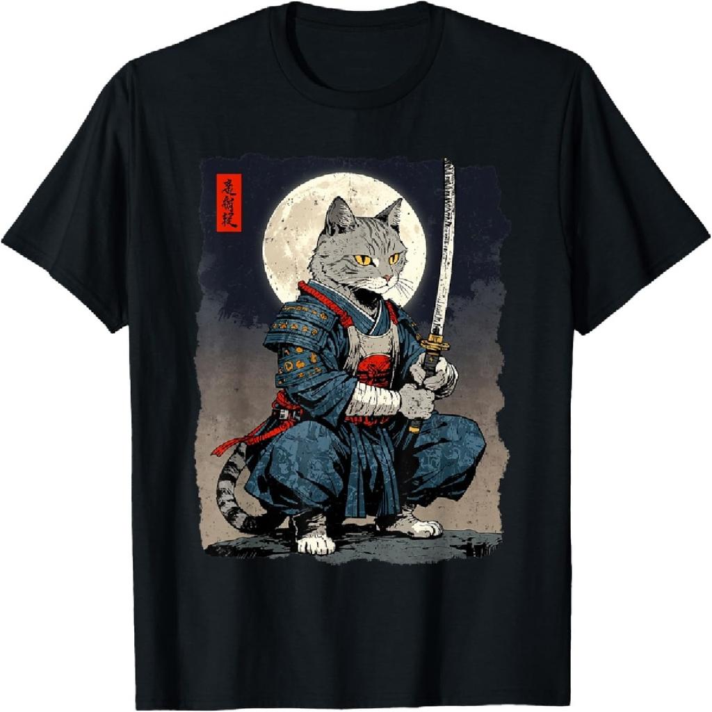 Самурайский Кот Японский Ретро Кот-Боец Кот Луна Укиё-э Воин Футболка