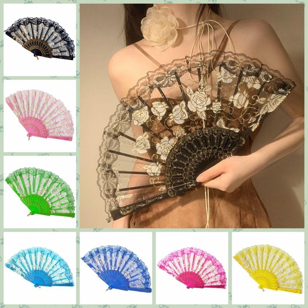 Ornaments Handheld Ladies Lace Hand Fan Translucent Plastic Handle Folding Fan Rose Pattern Spanish Fan Summer
