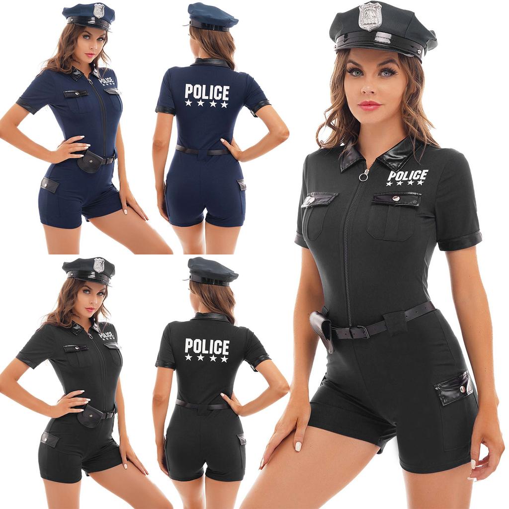 Женщины Полицейские Наряды Полицейская Ролевая игра Костюм Молния Короткий рукав Комбинезон с поясом Кошелек Шляпа Манжеты.