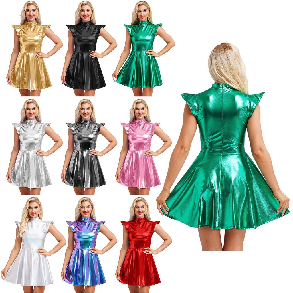 Женское блестящее металлическое платье - с воротником-стойкой, рукавами-колпачками, завышенной талией, А-силуэта, для вечеринки на Хэллоуин/клубной одежды (S-XXL)