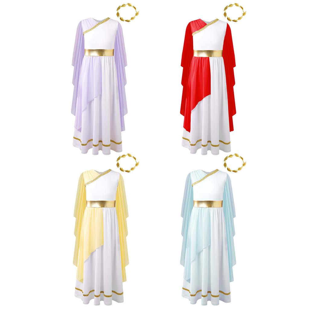 Детский костюм греческой красавицы для девочек на Хэллоуин с головным убором в виде золотой гирлянды из листьев, шифоновое платье-тога с короткими рукавами для вечеринки в стиле античности.