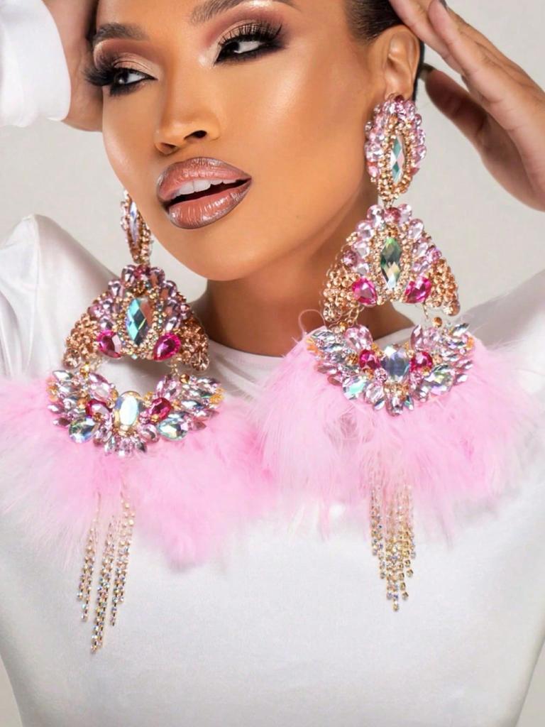 1 пара Розовые Перовые Преувеличенные Серьги с Подвеской-Кисточкой Женские Свадебные Богемные Украшения Сверкающие Большие Водные Алмазы Серьги
