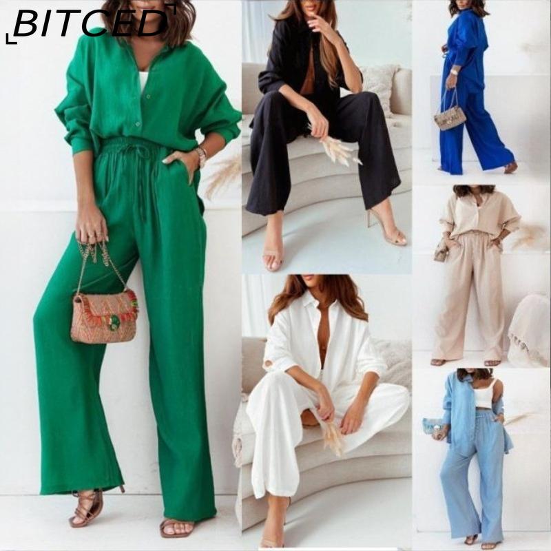 BITCED Модный осенне-зимний повседневный комплект из 2 предметов для женщин: рубашка с длинным рукавом свободного кроя, тянущаяся, мятая, и брюки широкого кроя.