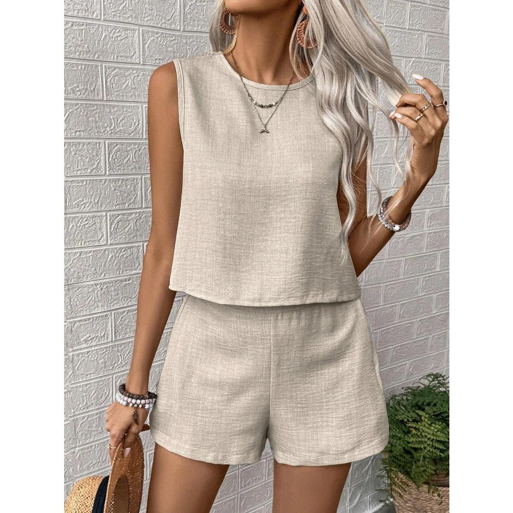 Женский однотонный простой модный повседневный комплект из топа без рукавов и шорт