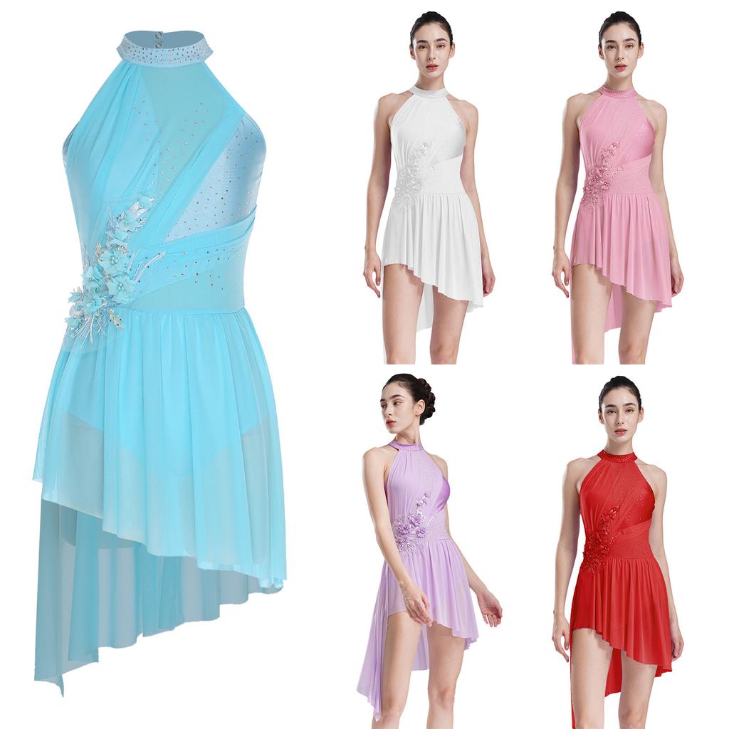 Женские балетные лирические танцевальные платья для фигурного катания, бретелька через шею, асимметричный подол, блестящие стразы, купальник