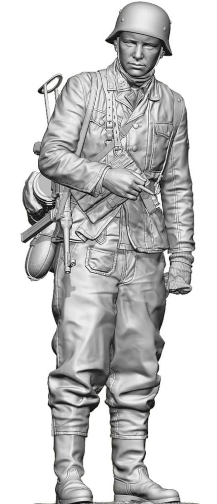Эта 3D-модель в масштабе 1/35 отличается высокой детализацией: напряженное выражение лица солдата сразу после боя, его правая рука без перчатки держит сигарету, его левая перчатка сжата в кулак, пистолет-пулемет MP40 перекинут через плечо, его полевая форма M43, подсумок для магазина на поясе и его снаряжение, включая пончо, флягу и лопату.