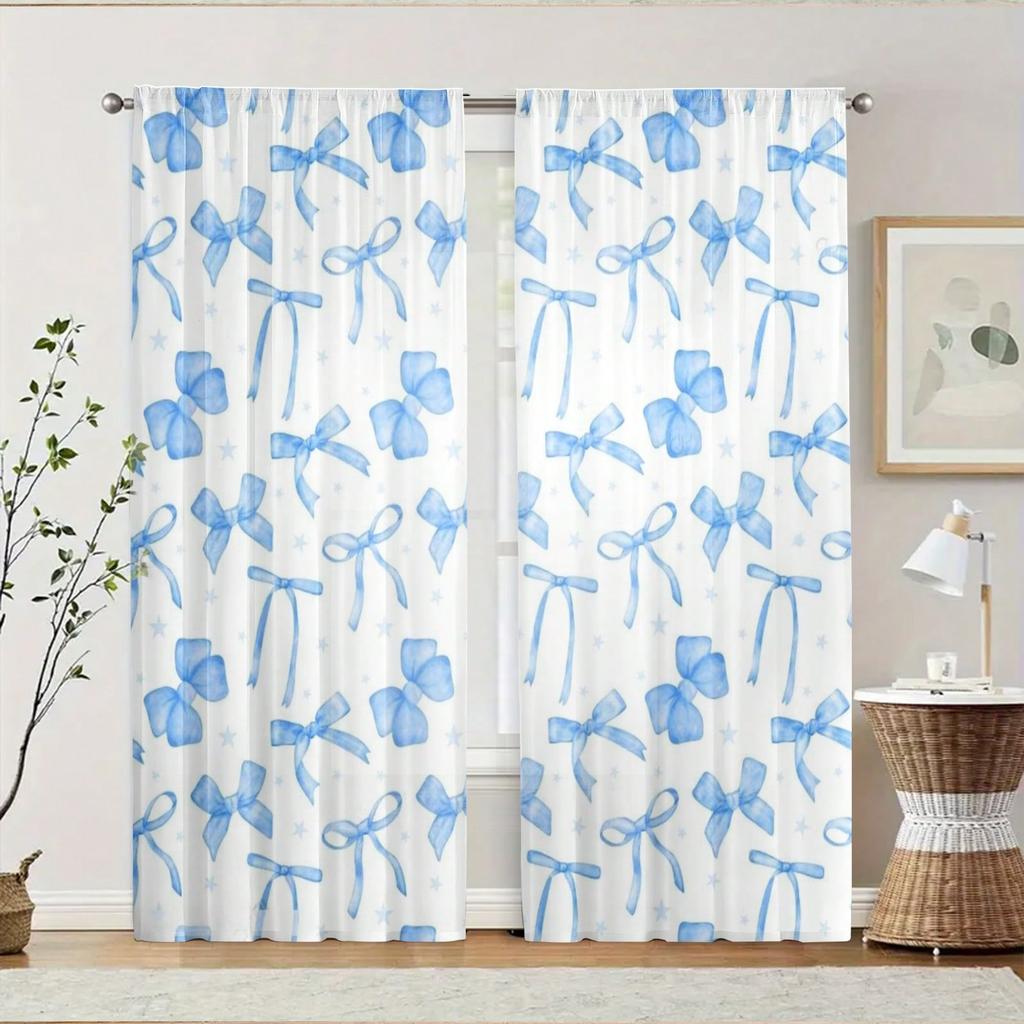 2pcs Polyester Blackout Curtains Cute Bow Decor Blue & White Color Soft & Skin-Friendly Suitable For Bedroom Living Room O