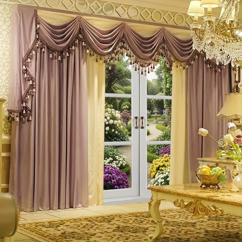 Роскошный европейский комплект штор: 2 Шторы + 1 Ламбрекен, Элегантный декор бахромой, Высококачественная отделка для гостиной и спальни