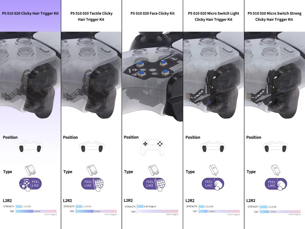 Комплект Extremerate Clicky Hair Trigger — это эволюционный кастомный комплект, добавляющий игровые функции к существующим контроллерам для PS5.