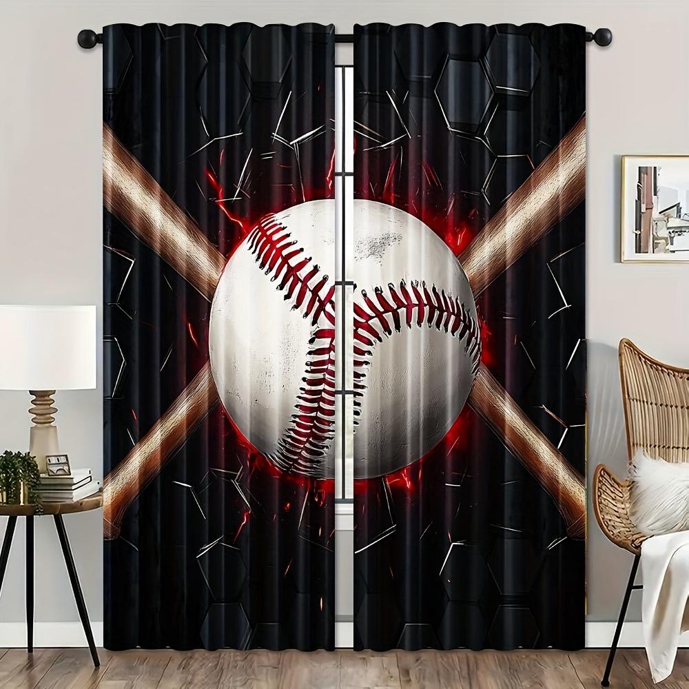 2pcs Baseball Bat Print Window Curtains - Black & Red Sports theme Window Drapes with Rod Pocket for Bedroom Living Room Offic