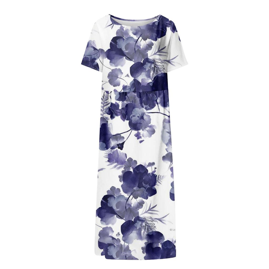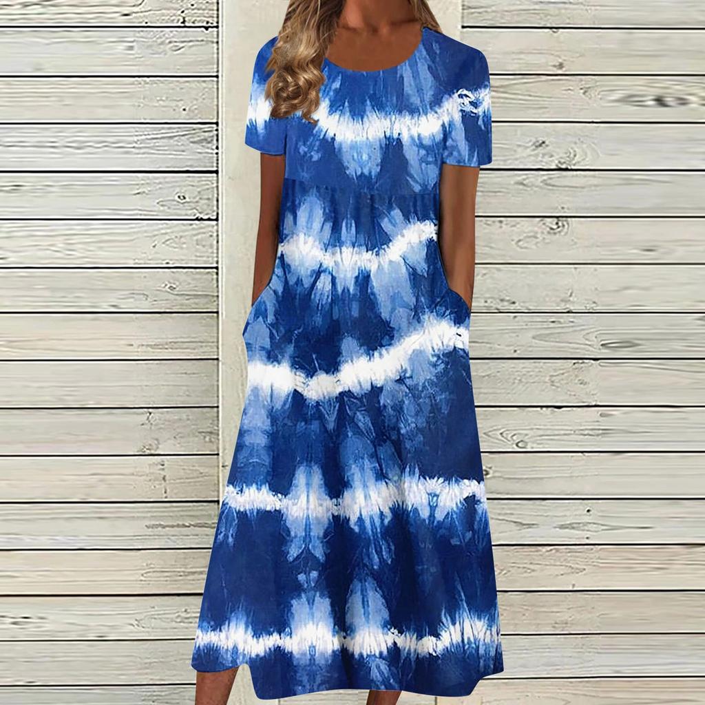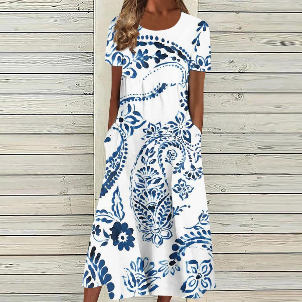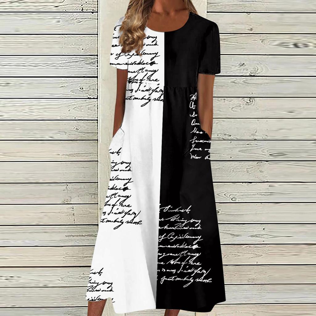 Женское летнее повседневное модное платье с коротким рукавом и карманом с круглым вырезом