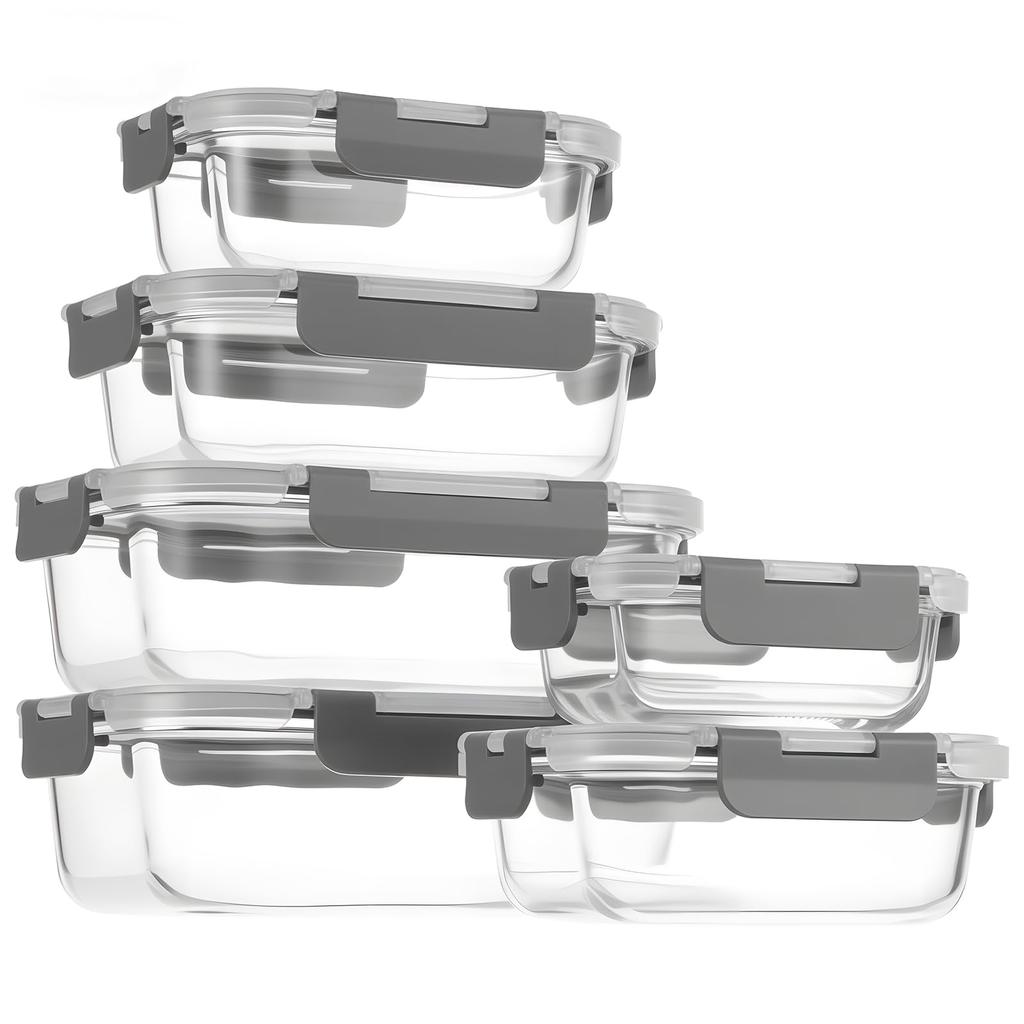 S SALIENT Glass Storage and Microwave Set of Gray Heat-Resistant Containers, Airtight, Tupperware, Make-Ahead, Rectangular, Oven, Dishwasher, Safe, 6,