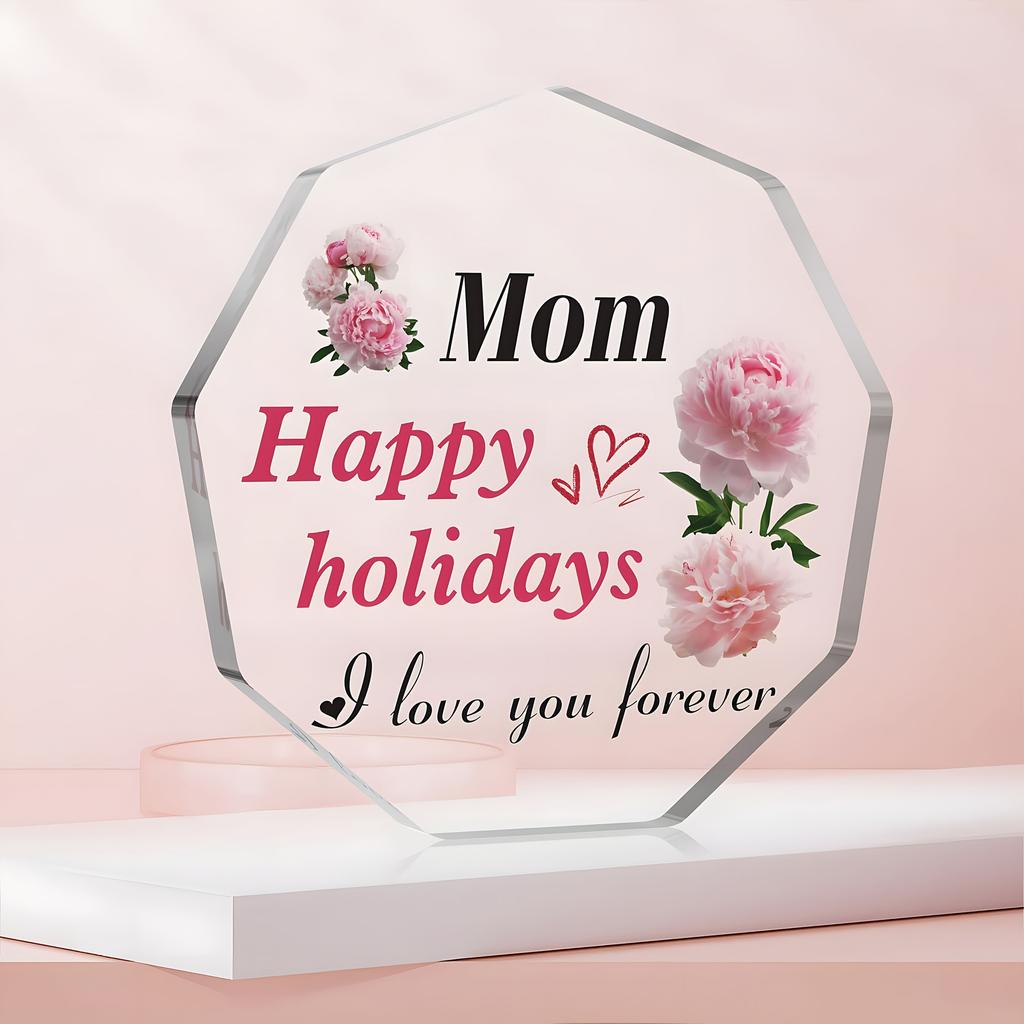 1 Acrylic Block Gift for Mom - Elegant Pink Peonies & Heart Accents, Engraved 'Mom Happy Holidays I Love You Forever' - Modern Decorative Keepsake