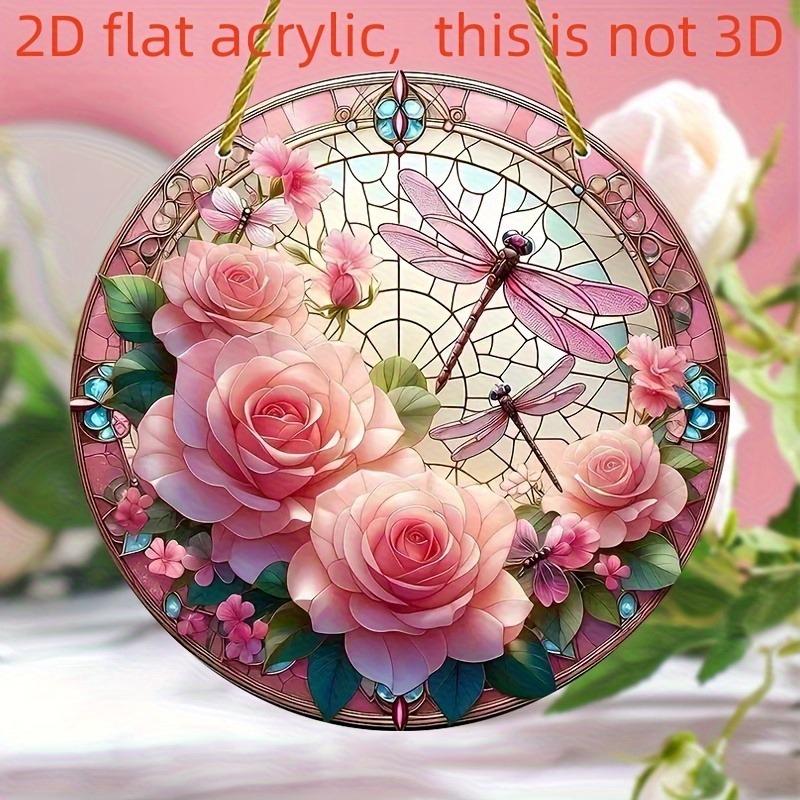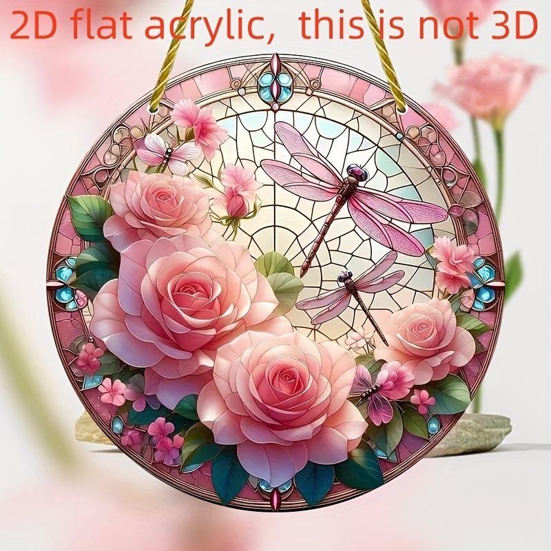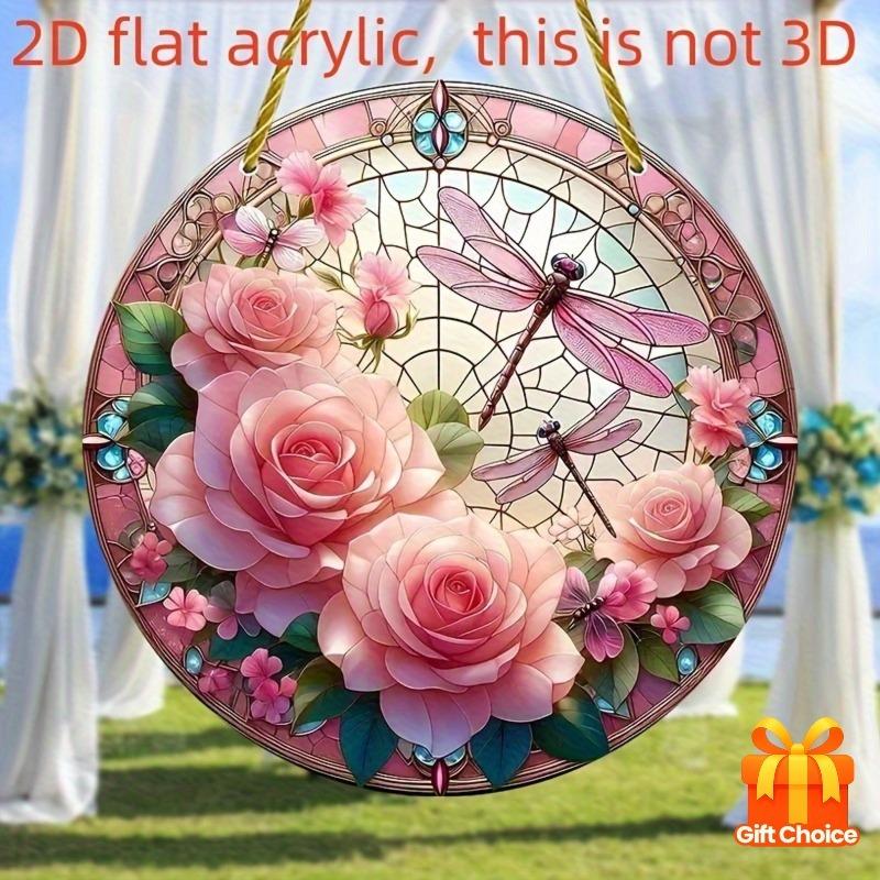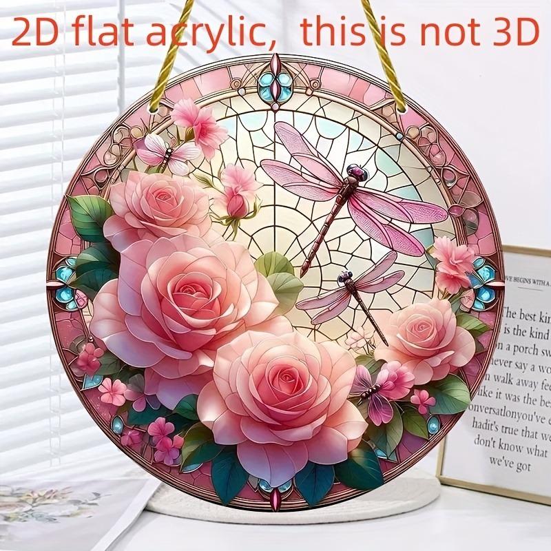 2D Flat Round Acrylic Decoration Sign, Red Rose, Pink Lotus and Dragonfly Design, Suitable for Wall Decoration, Porch, Room, Villa, Accents Home, Hall