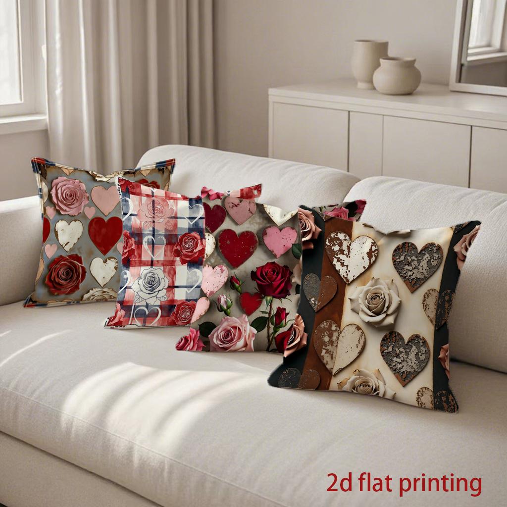 2D Heart & Rose Patterned Digital Print Pillow Covers Pattern Cushion Cover Suitable For Sofa Bedroom Car Pillow Cover