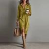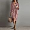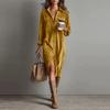 Винтажное Женское Платье Весна Лето Офисная Леди Однотонный Вельвет Длинный Рукав Воротник Рубашка Свободные Макси Платья для Женщин