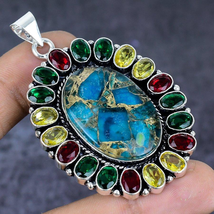 Натуральный медно-бирюзовый драгоценный камень 925 пробы стерлингового серебра Подвеска 2,56" ETC-13792