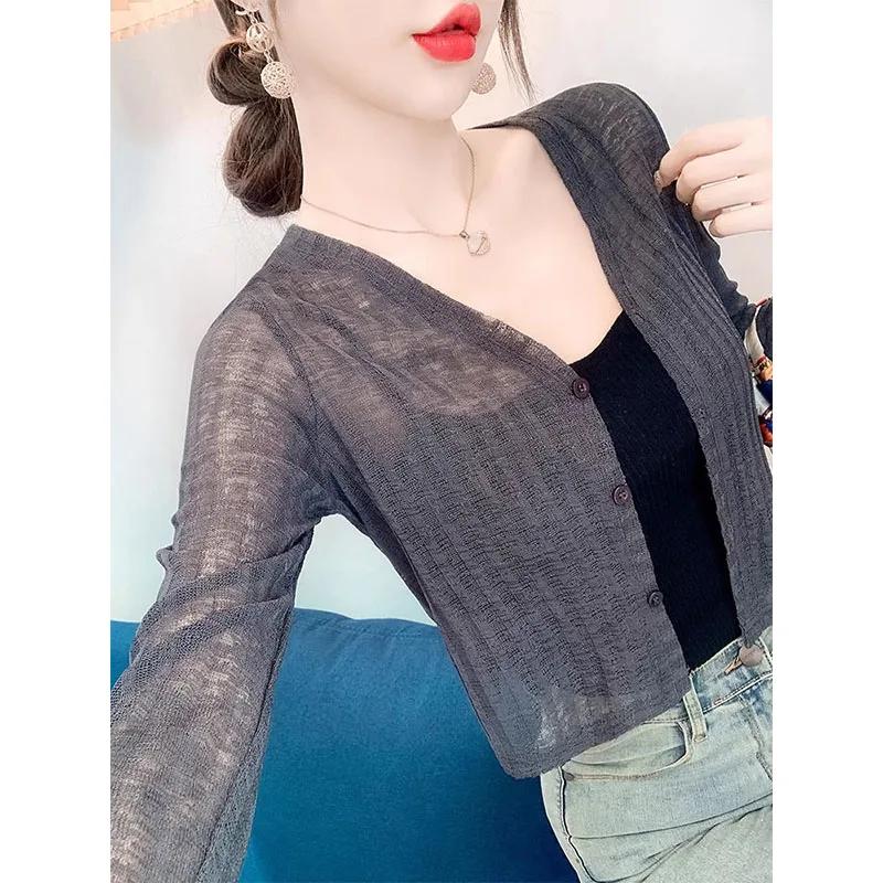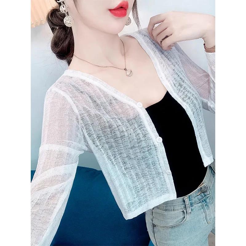 Женский бежевый прозрачный вязаный кардиган с длинным рукавом, укороченный, на пуговицах, повседневный топ для защиты от солнца