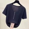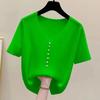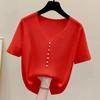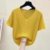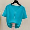 Женский вязаный топ с V-образным вырезом, короткий рукав, пуговицы-жемчужины, повседневная свободная блузка