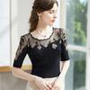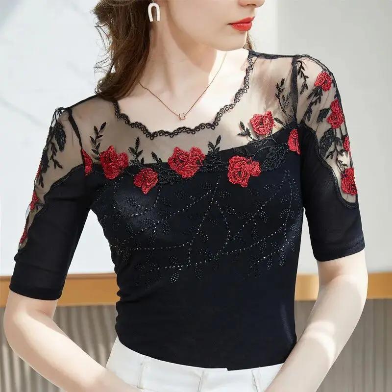 Женский черный топ с кружевной вставкой, рукав три четверти, вышивка розами, стразы, повседневная приталенная блузка — купить товар онлайн с бесплатной доставкой по всему миру!