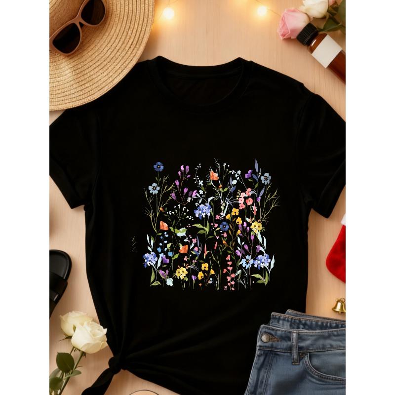 Женская футболка из полиэстера с цветочным принтом "Сад" Круглый вырез Короткий рукав Серый Белый Черный 3 Цвета Повседневная Для поездок на работу На открытом воздухе Ежедневная Домашняя Кампус Праздничная Семейная одежда