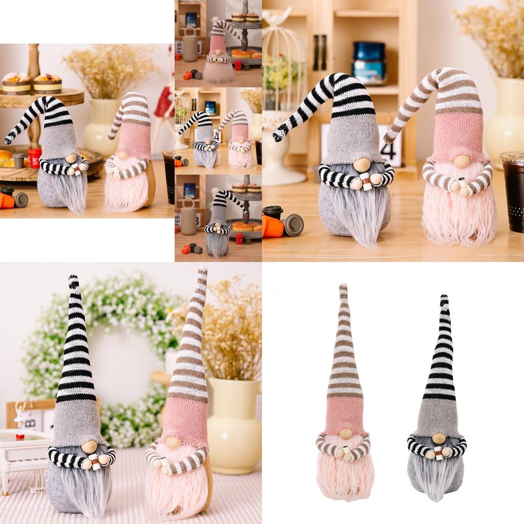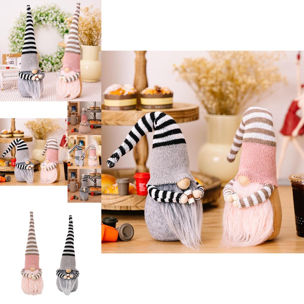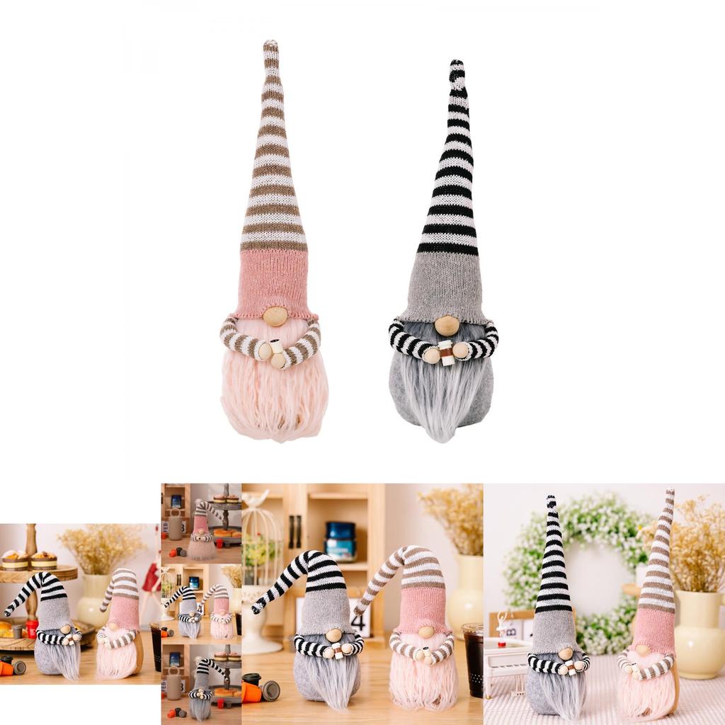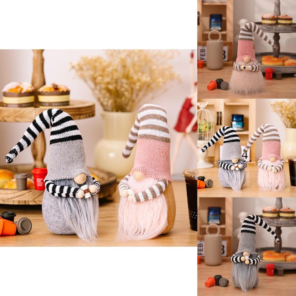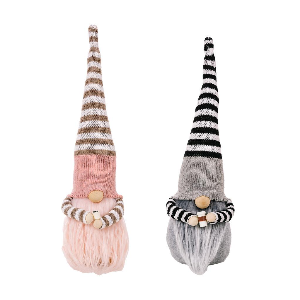 Adorable Plush Gnome Figurine Decor For Christmas Featuring Striped Long Hat Design In Coffee Gray And Pink
