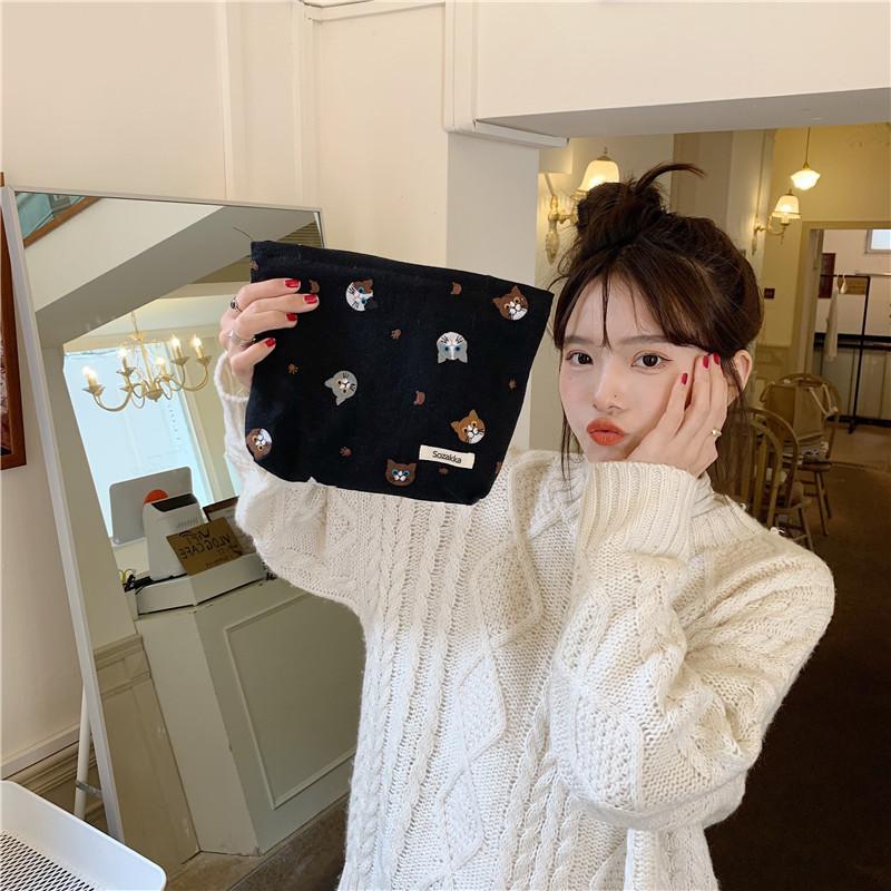 Cute Japanese Style Cat Linen Cosmetic Bag Lipstick Storage Pouch Pen Case Black Gray Beige Soft Canvas Zipper Closure