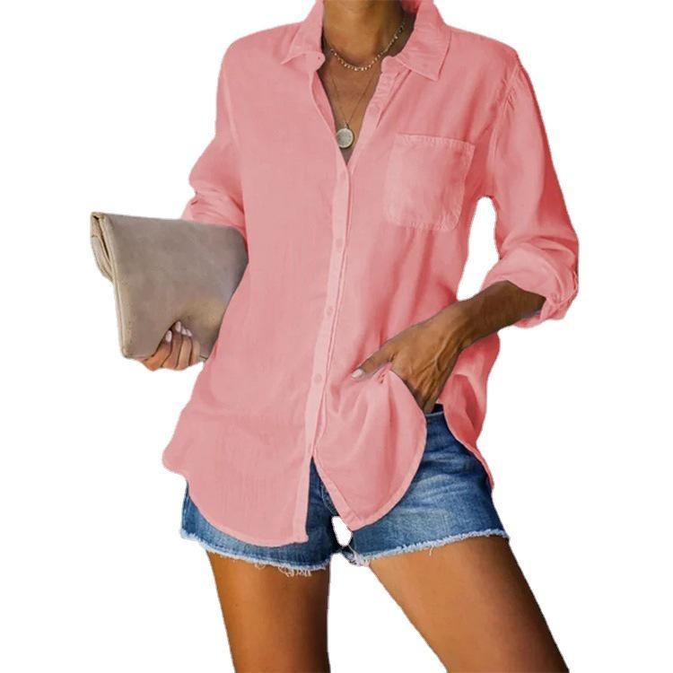 Эта женская повседневная рубашка большого размера свободного кроя однотонной расцветки на пуговицах предлагает идеальное сочетание комфорта и стиля.. Эта рубашка, изготовленная из высококачественного хлопка, обеспечивает воздухопроницаемость и мягкость, что делает ее идеальной для ношения в течение всего дня.. Благодаря однотонному узору и классическому воротнику-стойке, он без труда облагораживает любой повседневный наряд.. Длинные рукава и свободный крой добавляют расслабленности, делая его универсальной базовой вещью гардероба для любого случая.