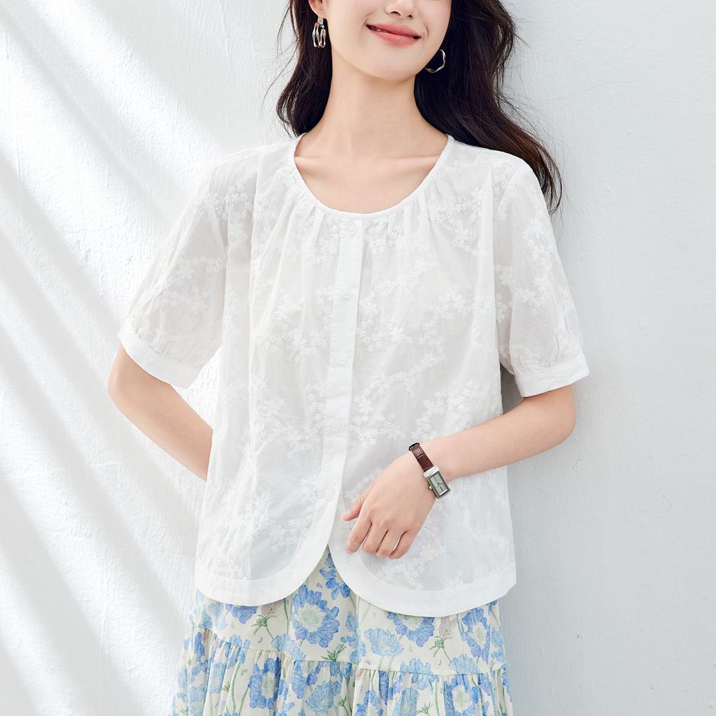 Apricot Embroidered Blouse for Women Short-sleeved Summer Latest Small Round Neck Top Pure Cotton Embroidered Blouse