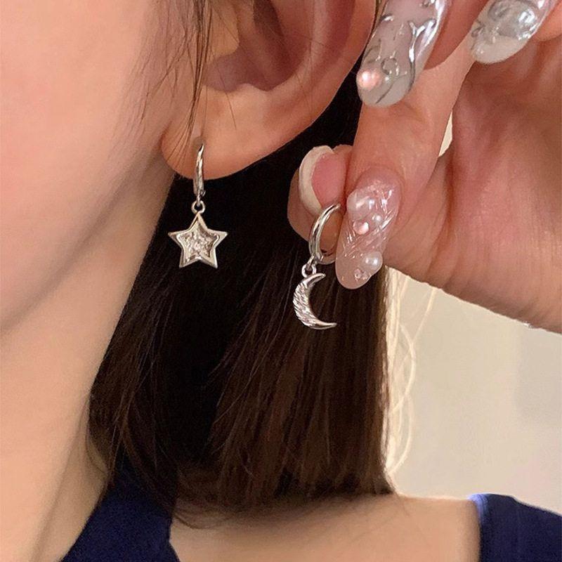 Ins Cold Wind Asymmetric Star and Moon Stud Earrings Niche Temperament Versatile Senior Sense Ear Buckle Earrings Female Ambience Back To School