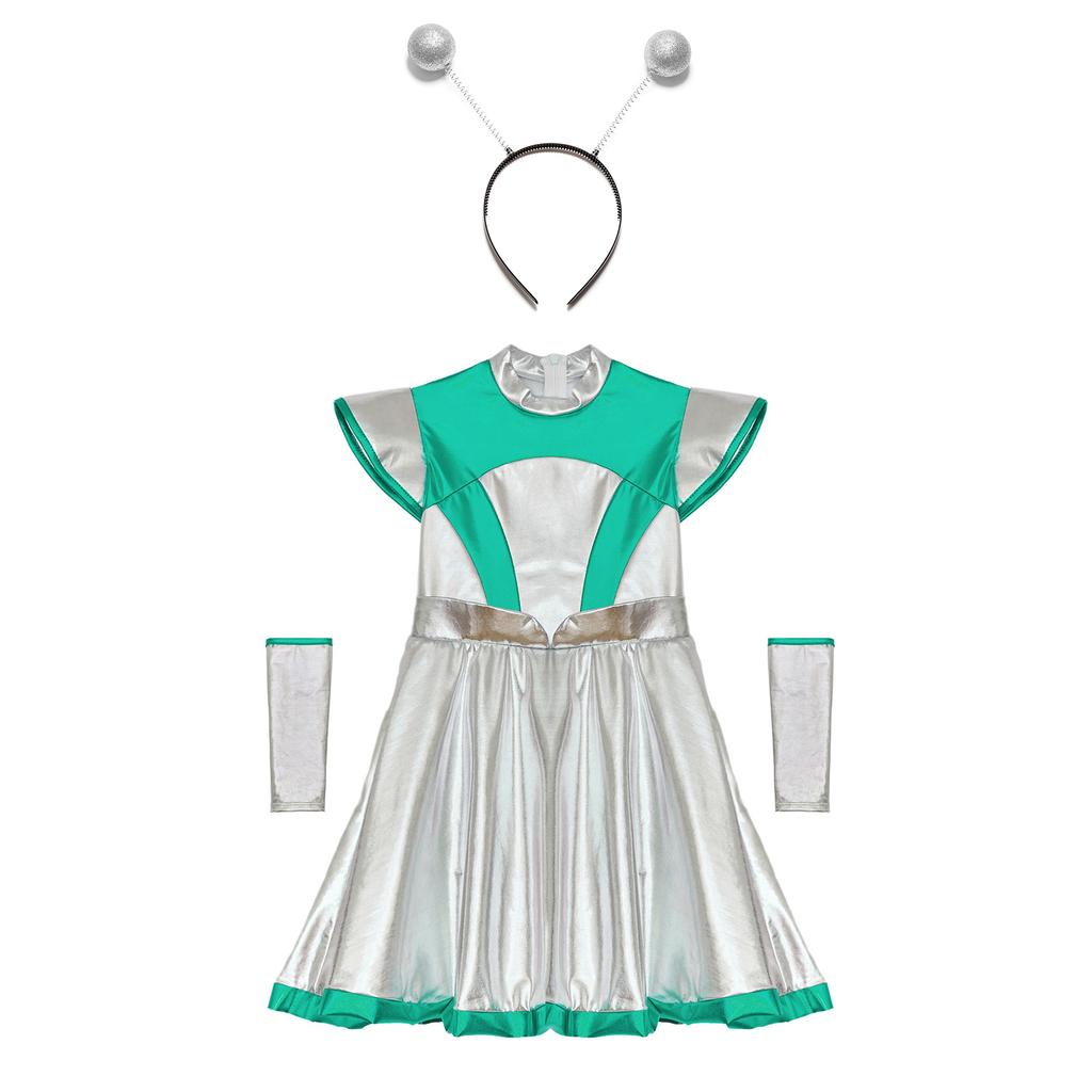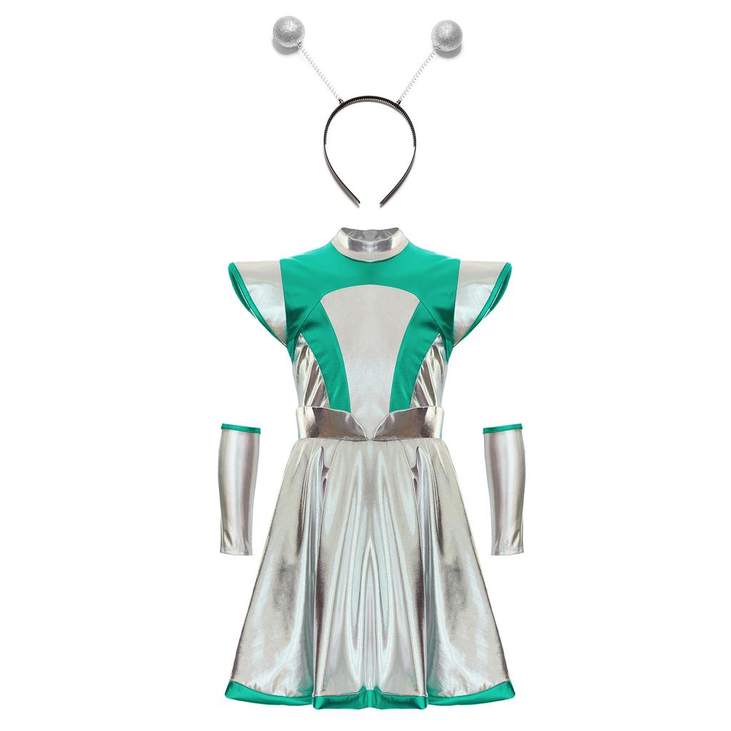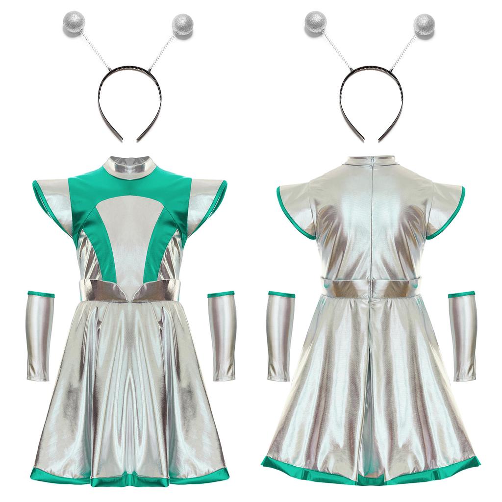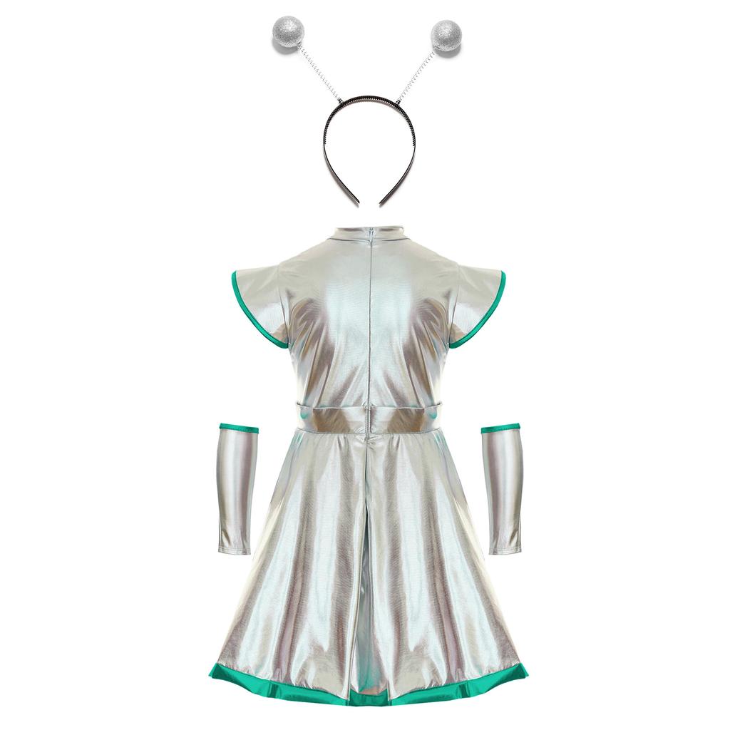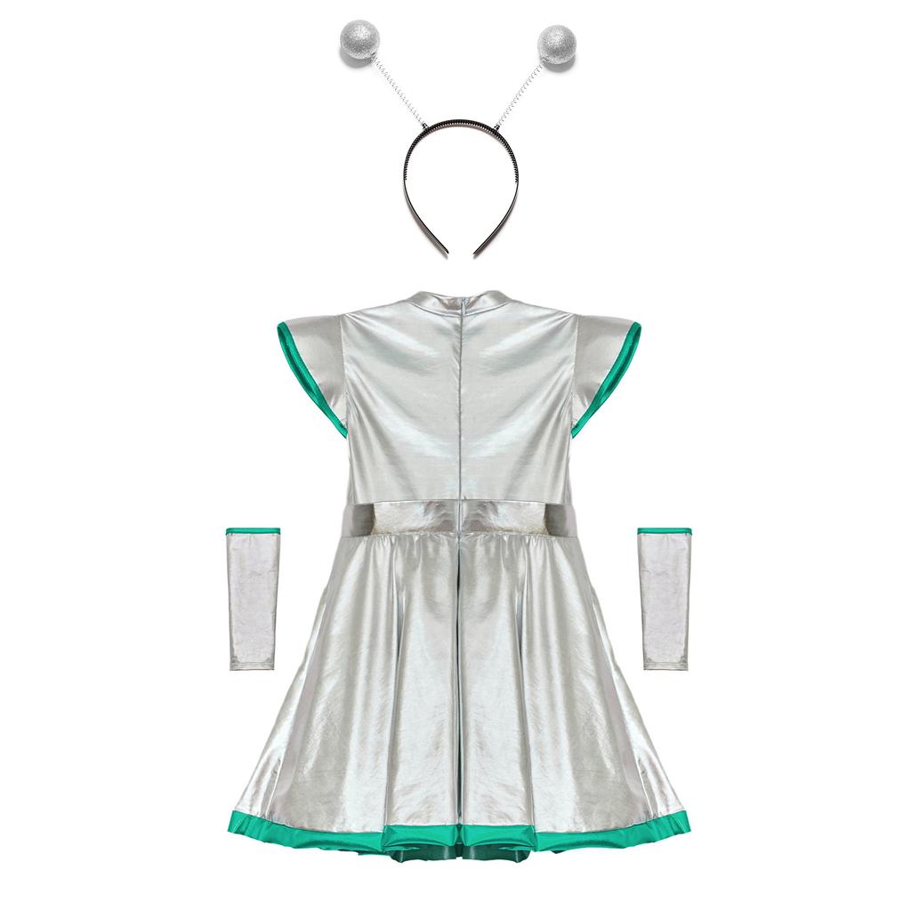 Набор детского костюма для косплея инопланетянки на Хэллоуин для девочек из 3 предметов - Платье «Милашка из космоса» с нарукавниками и аксессуаром-обручем для волос