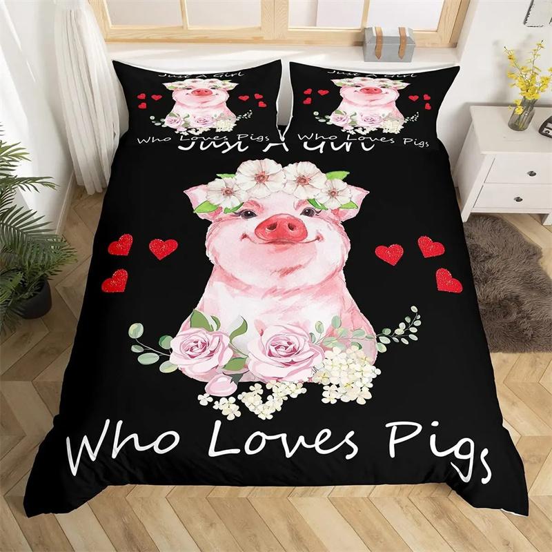 Premium Pink Pig Comforter Cover Cartoon Pig Pattern Bedding Kawaii Animal Sweetheart Floral Print Duvet Cover Children Boys Room Decor