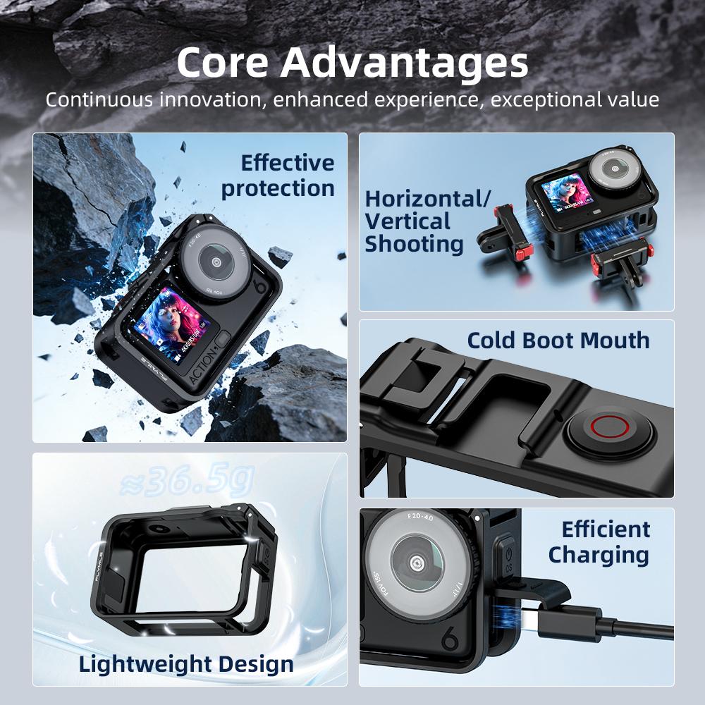 •【Удобная зарядка】Боковой вырез позволяет открыть крышку и зарядить вашу Action 6 через порт Type-C, не вынимая ее из клетки. Эта функция обеспечивает бесперебойное использование и повышает общий комфорт.