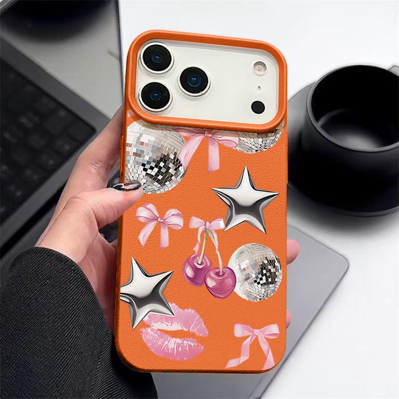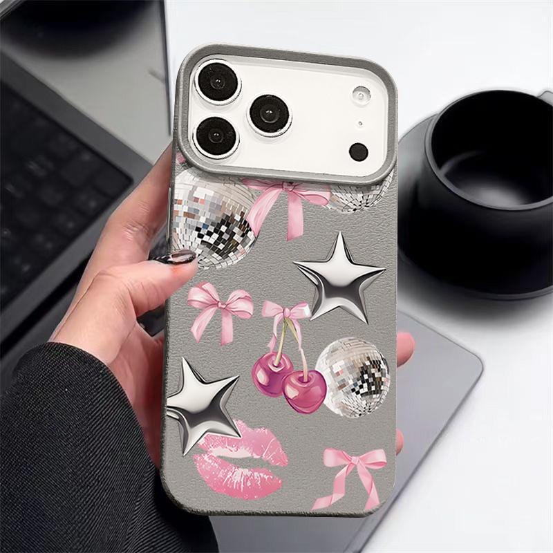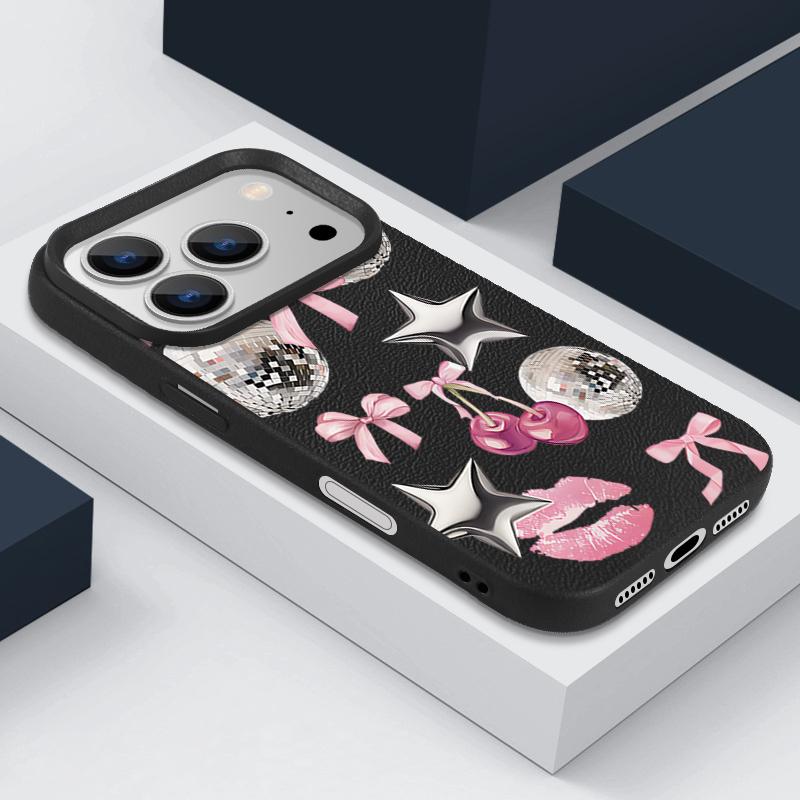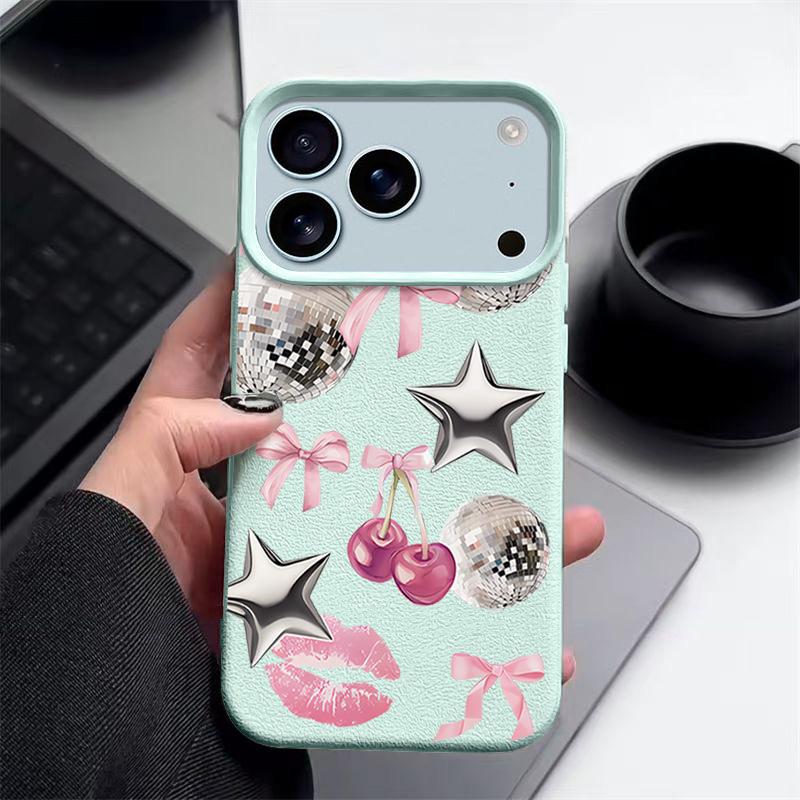 Cherry Bowknots Lips Disco Ball Pattern Case For iPhone 17 Pro Max iPhone 16 Pro Max 15 14 13 12 11 16E Air Luxury Leather Texture Silicone Cover