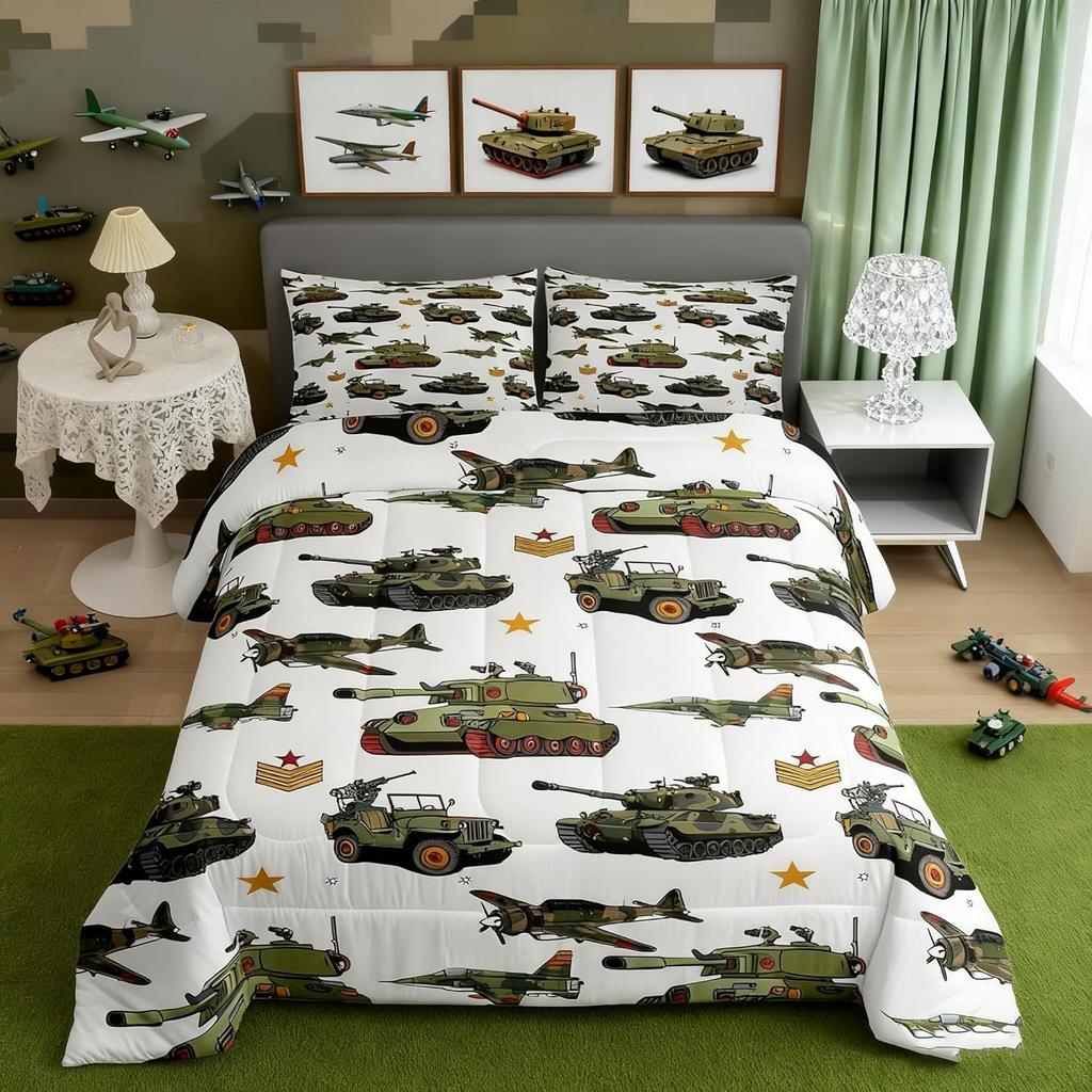 War Theme Set Full Size Aircraft Tanks Bedding Set for Kids Boys Bedroom Decor Retro Army Green Airplane Tanks Soft Polyester